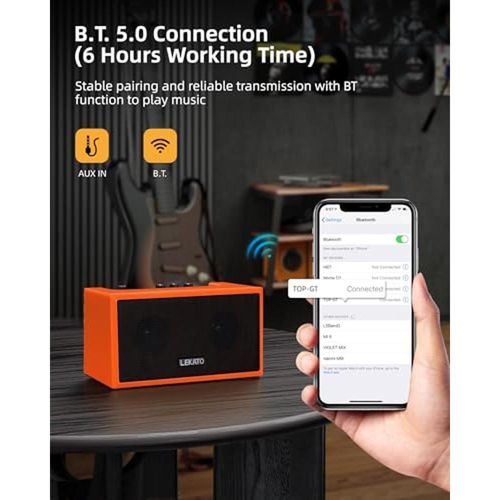 - Wireless Bluetooth Connect: LEKATO electric guitar amp supports B.T (5.0) audio function which allows you to play with your favorite tracks directly from your smartphone or other Bluetooth-enabled devices. You can also practice with the accompaniment.