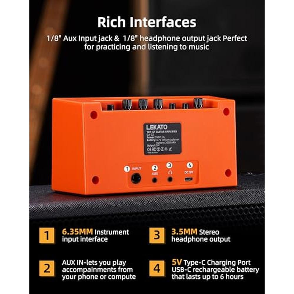 LEKATO GA-02 Mini Guitar Amp with Clean Overdrive Effects Electric Guitar Amplifier 5W Rechargeable Guitar Amplifier Small Guitar Headphone Amplifier Bluetooth Guitar Amp for Daily Practice Portable Guitar Amplifier. Use It to Jam, Play and Listen to Music Anywhere and Anytime Function: Overdrive/Clean: Clean and Distortion, which can be switched by one button. Volume Control Tone Control Gain Control Bluetooth Connect 5V Type-C Charging Port Working Time: 6 hours MINI Size: 4.53"/11.5cm*2.76"/7cm*3.23"/8.2cm Package Include: 1*GA-02 Guitar Amplifier 1*USB-C Charging Cable