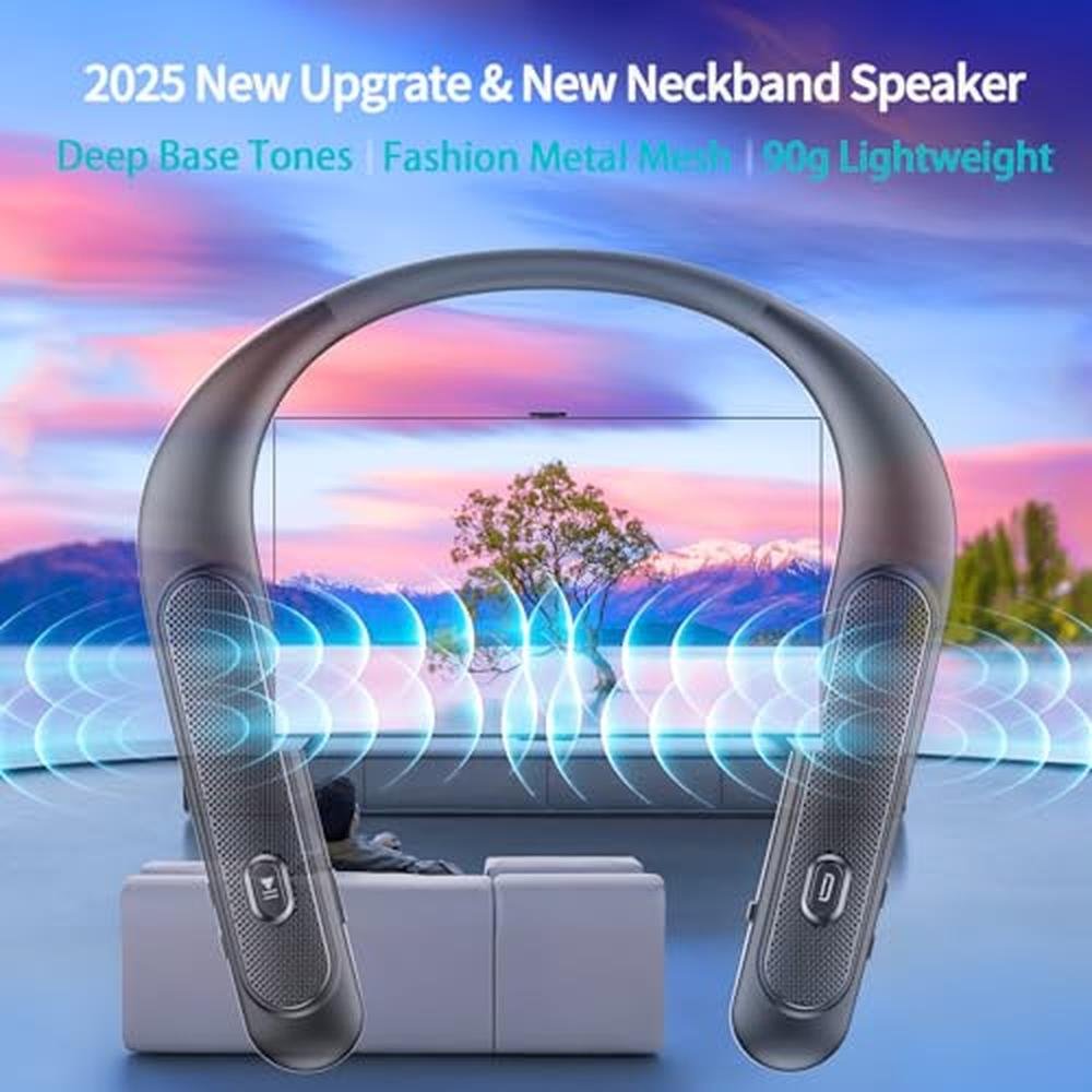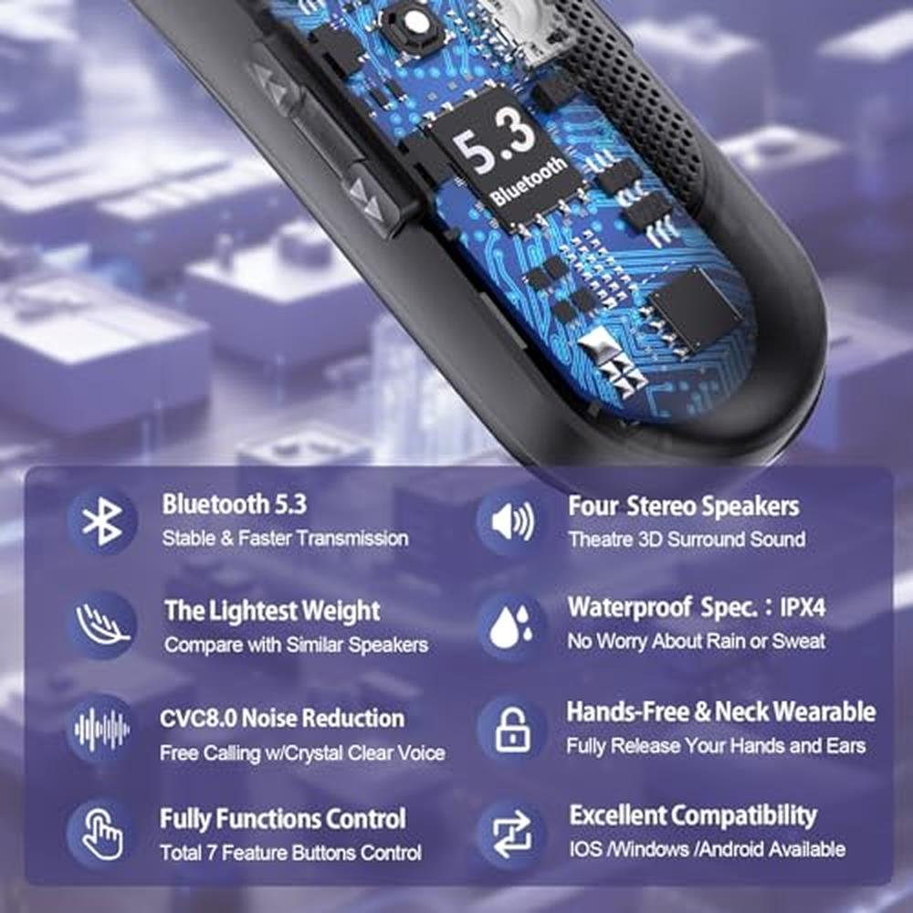 2025 New Release Neckband Speaker w/ Latest Bluetooth 5.3 Technology The new upgrated speaker adopts the latest bluetooth 5.3 technology, consuming less power than bluetooth 5.0 while achieving a more stable connection and faster communication, no signal loss or music interruption. With multi-point support, connect two devices simultaneously. Transmission is stable up to 33 feet (10 meters), and it's compatible with all bluetooth-enabled devices,delivering lossless HD sound..