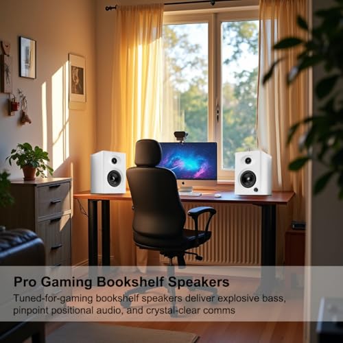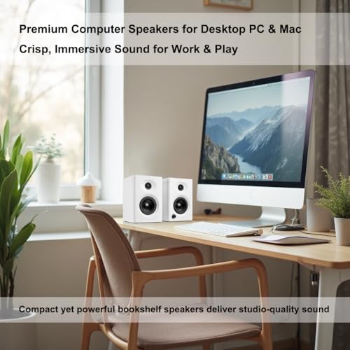Elevate your workspace with these powerful computer speakers for desktop PC, designed for small home offices and productivity setups. These powered bookshelf speakers deliver crystal-clear audio with deep, resonant bass, perfect for video calls, turntables, and multimedia. The precise sound staging ensures balanced highs and mids for clear dialogue and immersive playback.