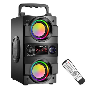 - Multi-function Portable SpeakersThe Speaker Support FM radio, TF Card music playback, AUX input, 3.5MM Microphone Jack, U-disk music playback, intelligent remote control and digital display. FM radio can automatically search and save all available stations by long press pause button . The remote control can control EQ setup and all functions of the wireless speakers without requiring you to move.