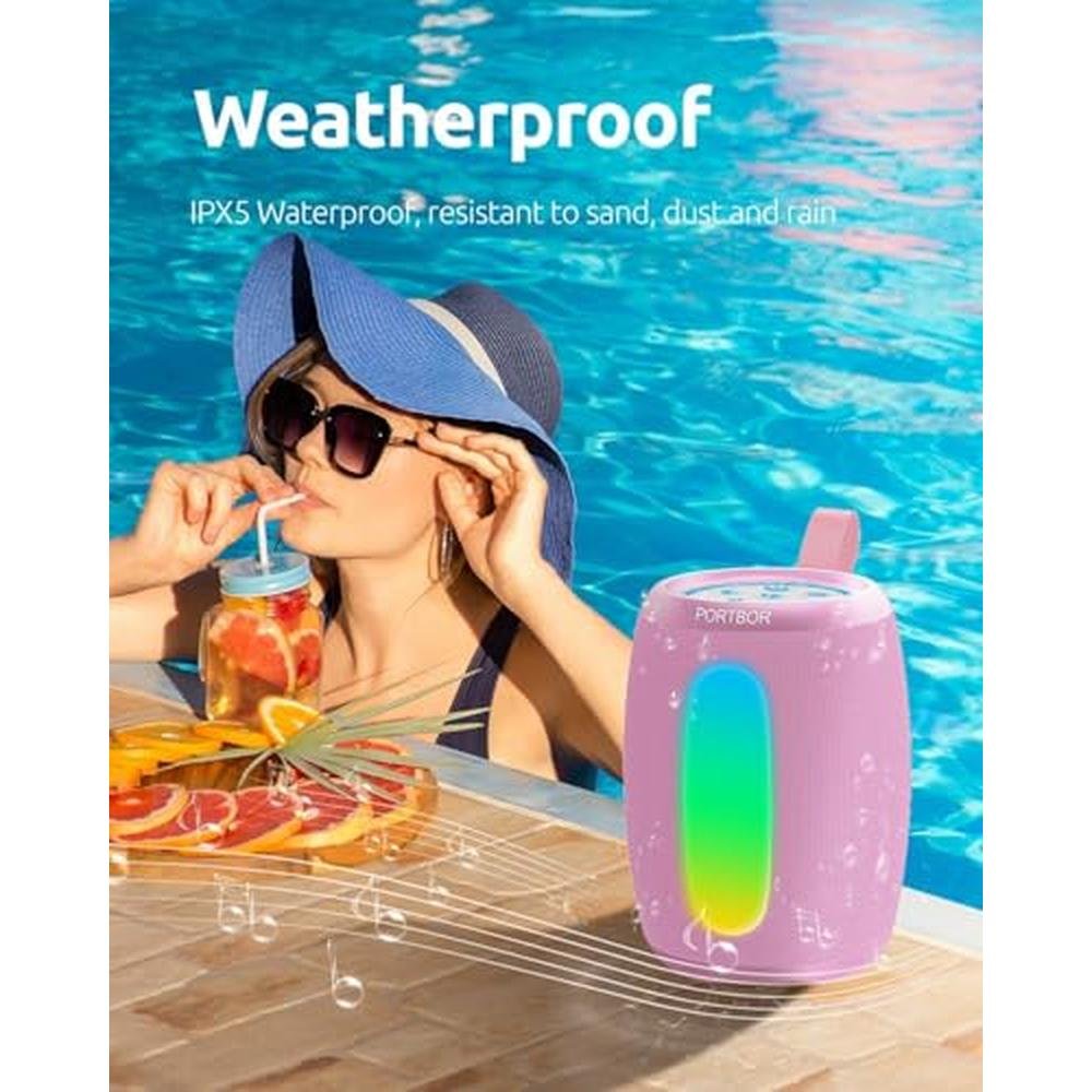 PORTBOR Bluetooth Speaker, Powerful Stereo Sound Portable Wireless Speaker with Lights, IPX5 Waterproof, TWS Pairing, for Outdoor Camping Hiking Beach Party Home Studio, Ideal Birthday Holiday Gift Wireless Portable Speaker KBR-SP02, is a small portable wireless speaker and music player, which has loud, strong, stereo and powerful sound. This wireless speaker system adopts BT 5.3 technology, can fast compatibility with iPhone Sumsang Apple and more smart cellphone, and great compatibility with laptop, computer, tv, tablet, projector,controller, gamer etc. It is a waterproof speaker, the speaker is tightly wrapped around by nylon cloth, and the type C USB Port and aux input port are covered by a rubber, which can be waterproof and sandproof, and used in the bathroom, the beach, bathing, swimming pools, and other places, not enough to be afraid! It is also a blue tooth speaker with FM radio, which can be used as a portable radio to search for channels directly without adjustment frequency, which is simple and convenient. It works well both at home, patio and outdoors! This small bluetooth speaker bocinas blutooth is a useful electronic gadget. It has a unique and compact design, it is a best gifts for him, her, girls, boys, teens, fathers, mothers,women,boyfirend on birthday, party and holidays. Overall, this is a top-notch extremely cost-effective portable speaker.
