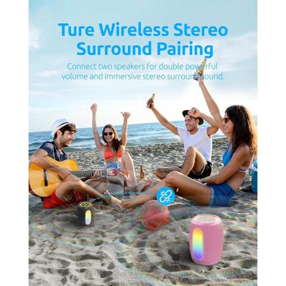 Portable Bluetooth Speaker with Lights, Powerful Sound, IPX5 Waterproof, Wireless BT5.3, TWS Pairing, 15H Playtime, for Outdoor/Home/Party/Beach, Stocking Stuffers, White Elephant Gifts (Pink)