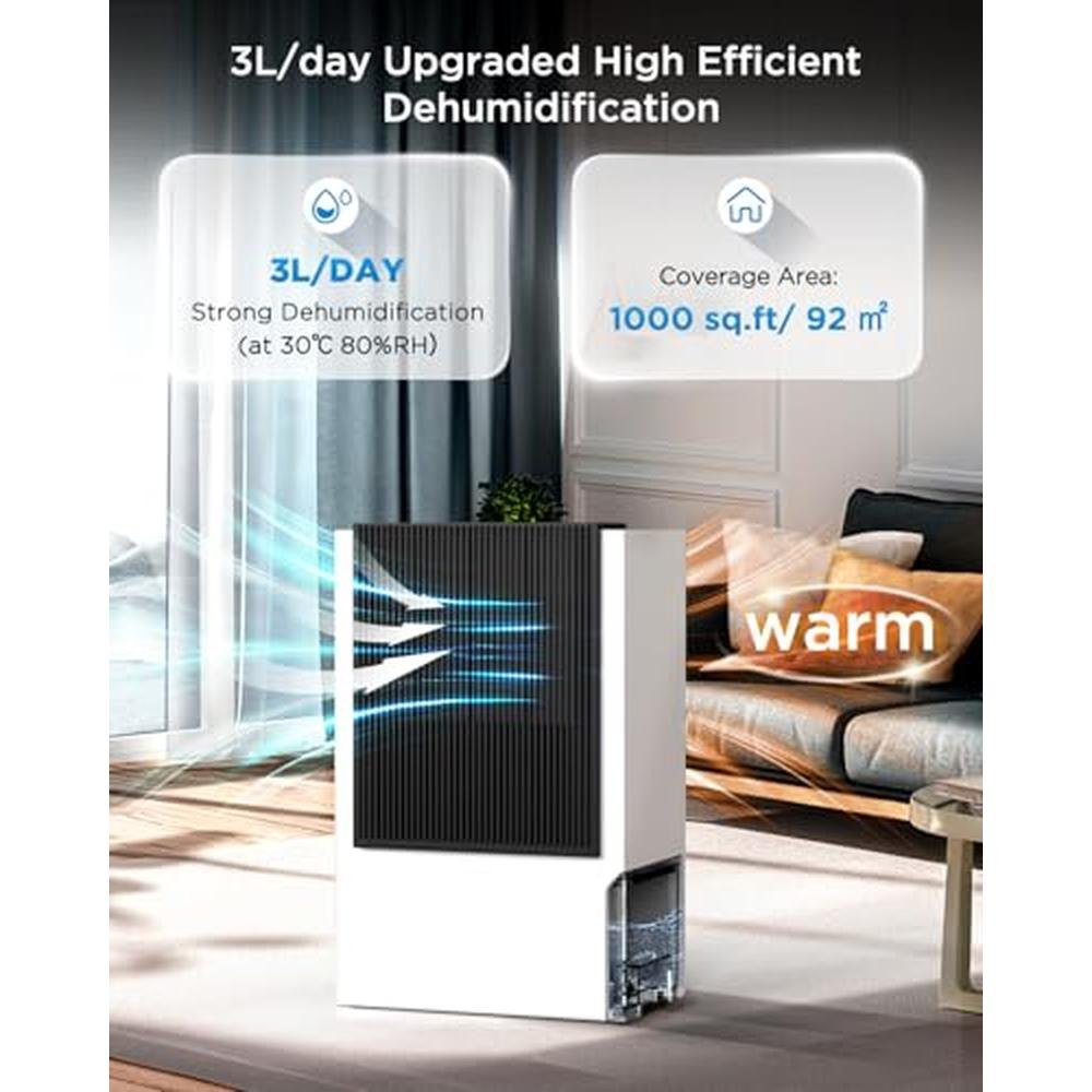 | Special Feature | Auto & Manual Drainage With 6.6ft Drain Pipe, Maximum dehumidification capacity 3L/day, Sleek, Modern, and Portable for Any Space, Stable dehumidification throughout the year, Strong Modes and sleep Modes (30 dB) |