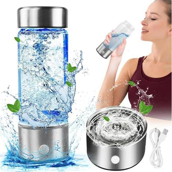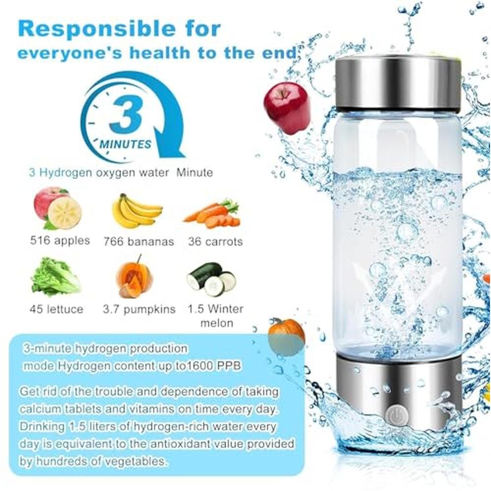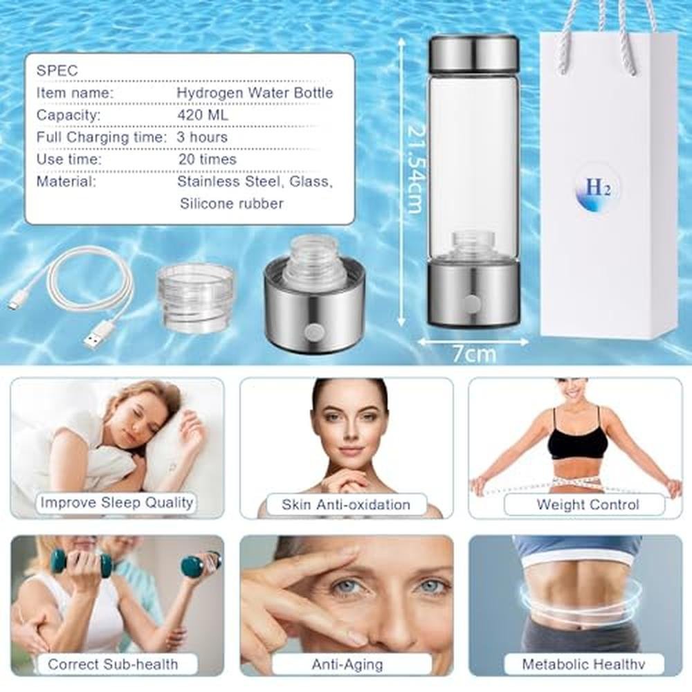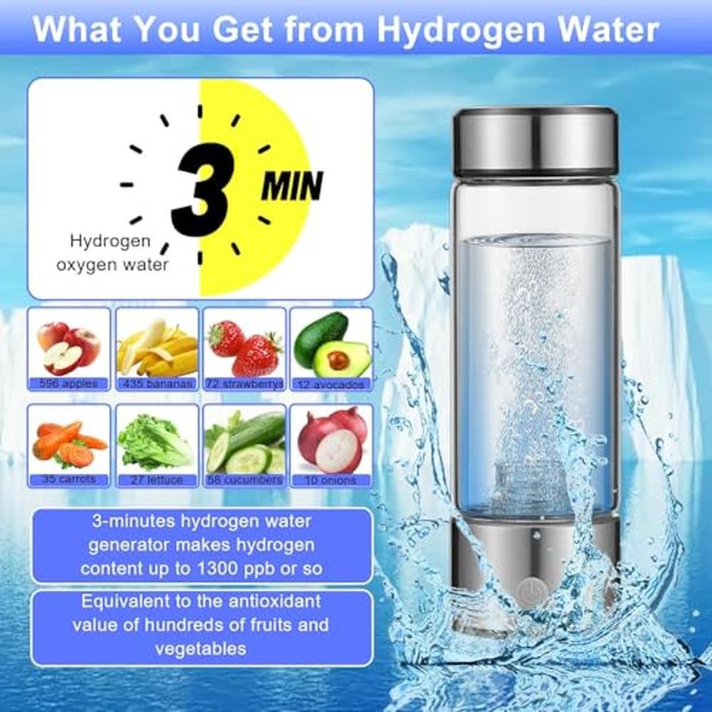 Upgrade Hydrogen Water Bottle, 3Min 2000PPB Hydrogen Water Bottle Generator -SPE PEM Tech, 14OZ Portable Hydro Water Bottle Machine, Birthday Xmas Gift for Husband, Wife, Family, Friends,Travel Hydrogen Water Bottle, 3 Min Rapid Hydrogen Water Bottle Generator with SPE PEM Technology, Portable Hydro Water Bottle Suitable for Gym Office Travel Home, Gift for Love Friend Family, Silver 3 Min Revolutionize Hydration: Hydrogen water generator advanced SPE PEM hydrogen oxygen separation Technology. Turn tap water into alkaline water with a high concentration of 1400 ppb hydrogen ions, every sip of water replenishes energy. Suitable for those who need good hydration at exercise, home, work or while traveling. Equipped with a cup brush, it can easily clean the hydrogen water bottle. Antioxidant Benefits: Hydrogen Water Bottle delivers high-quality drinking water infused with hydrogen, known for its antioxidant properties. Regular consumption of hydrogen-rich water can effectively reduce oxidative reactions in the body, promoting metabolism and boosting immunity. (Note: Avoid adding non-electrolyzable water sources such as juice, milk, tea, distilled water, and purified water.) Leak-proof and Food-Grade Materials: Crafted from high-quality borosilicate glass, our hydrogen water bottle ensures durability and safety with its food-grade composition, free from harmful substances. The lid features a secure closed design and a thick sealing ring, providing robust sealing to preserve the hydrogen concentration within. Say goodbye to worries about leaks and focus on enjoying your refreshing, antioxidant-rich water wherever you go. 14oz Large Capacity Hydrogen Water Bottle: Designed with chic aesthetics and equipped with a non-slip EVE pad for stability, it is both stylish and practical. Thanks to its USB-powered operation, you can enjoy antioxidant-rich water on-the-go,