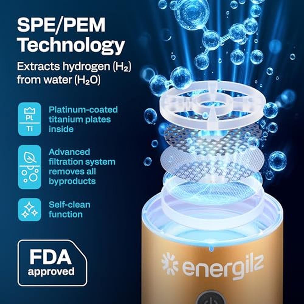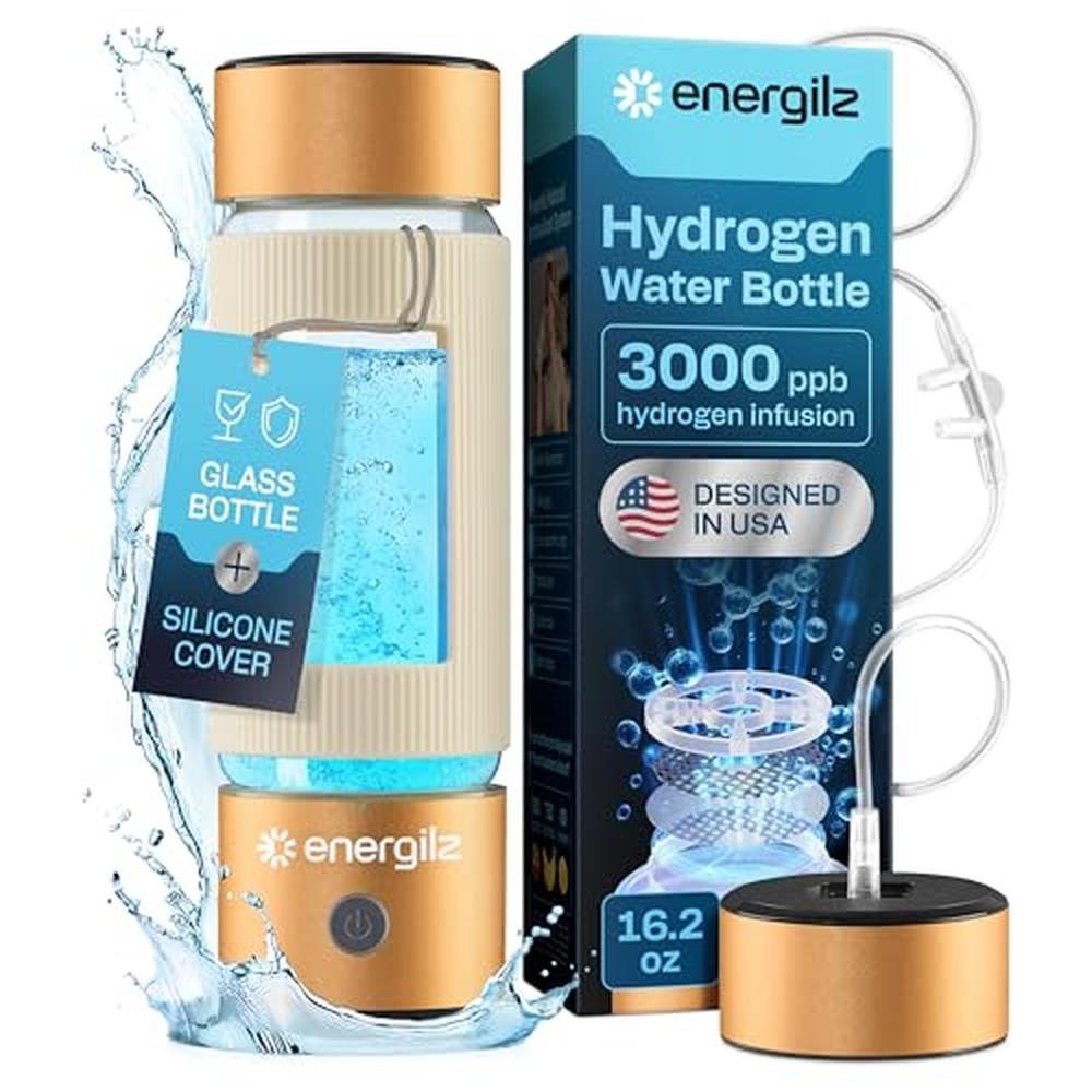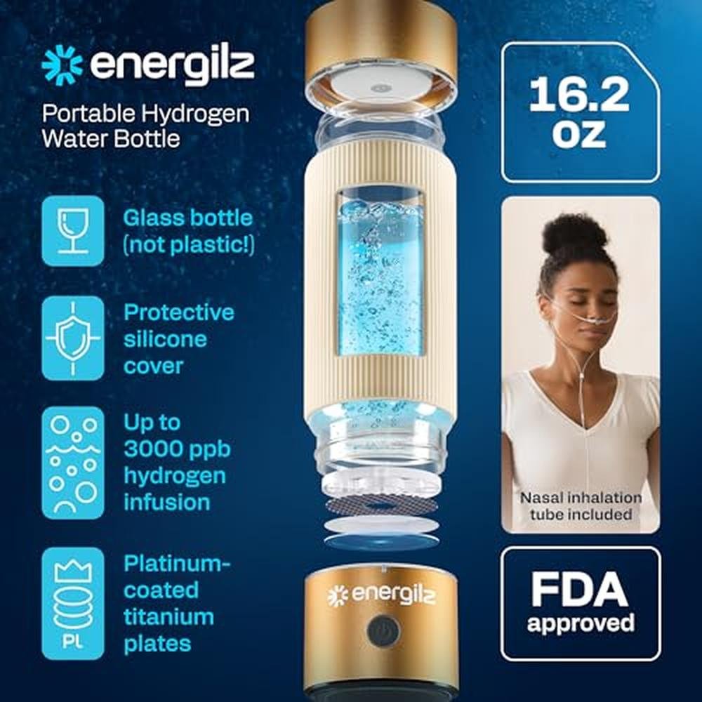 Energilz Hydrogen Water Bottle | Large 16.2 oz (480 ml) Hydrogen Water Bottle Generator 3000 ppb | Hydrogenator Machine | SPE/PEM Hydrogenated Ionizer Generator(Golden w/Beige)