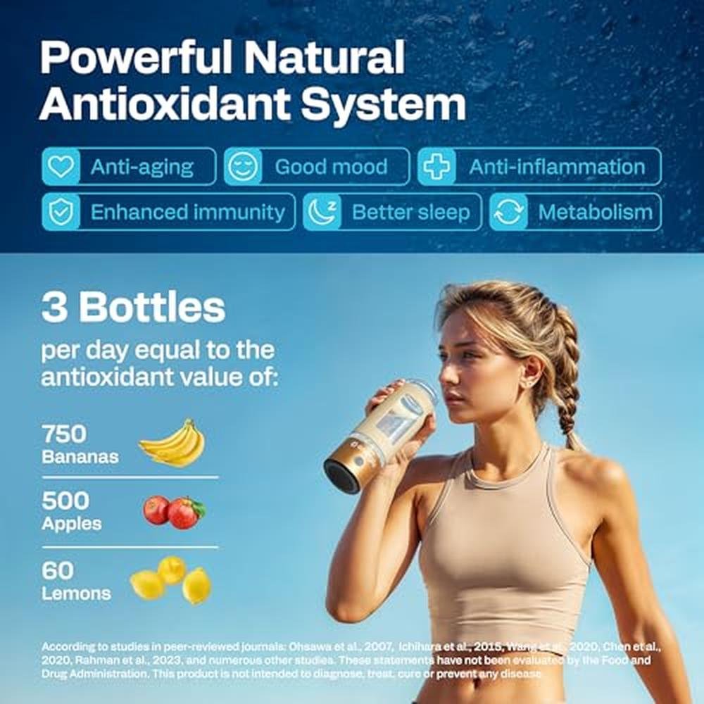 • ANTIOXIDANT POWERHOUSE IN EVERY SIP. Unparalleled antioxidant protection with a 16.2 oz hydrogen water generator for up to 1.44 mg of H2: equivalent to the power of 756 bananas. Hydrogenate water concentrations reaching 3,000 PPB in just 9 minutes