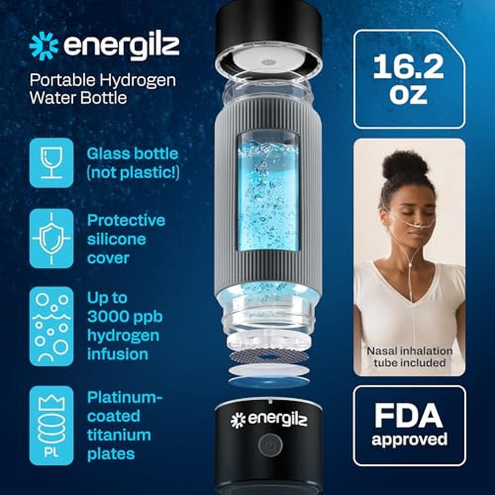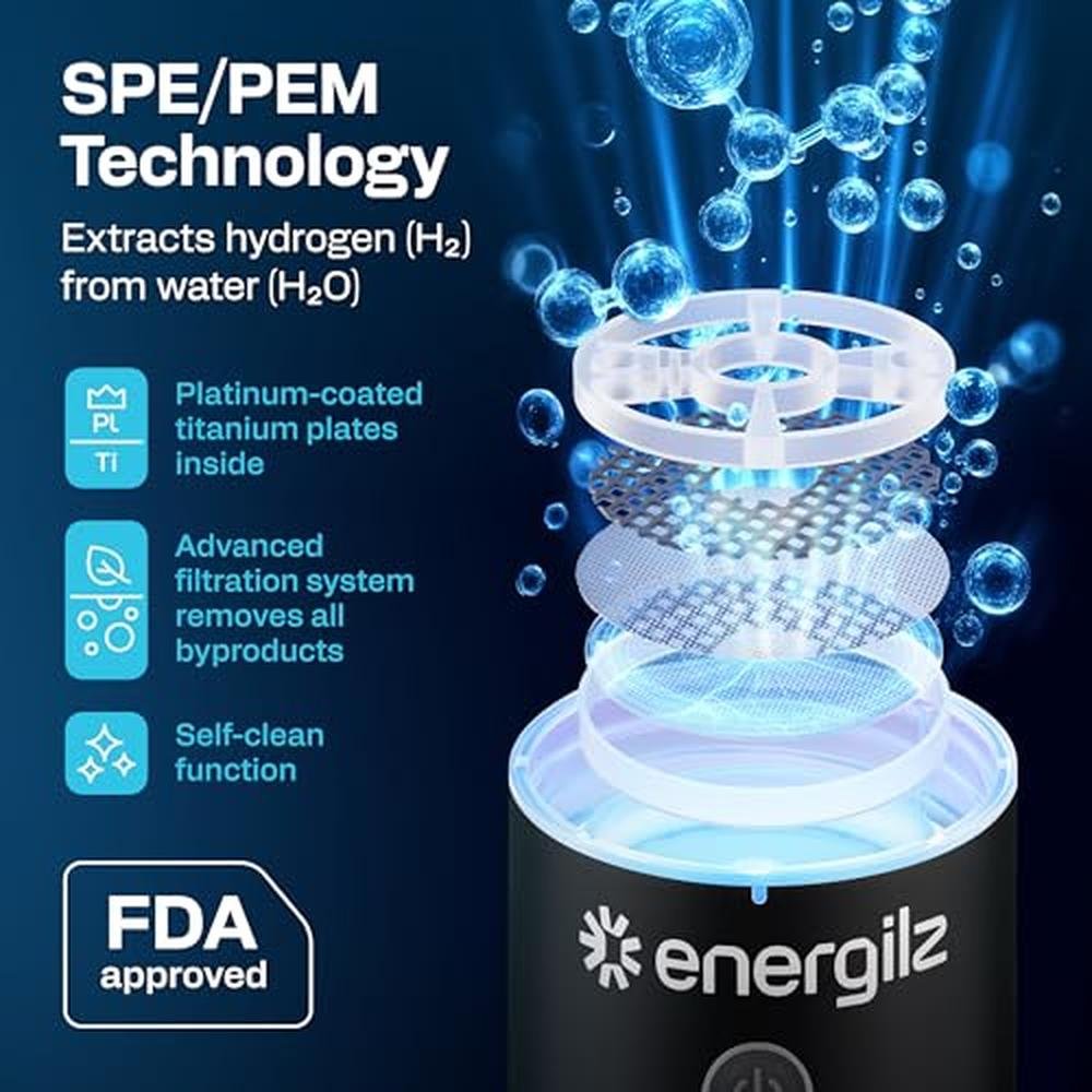 Energilz Hydrogen Water Bottle | Large 16.2 oz (480 ml) Hydrogen Water Bottle Generator 3000ppb | Hydrogenator Machine | SPE/PEM Hydrogenated Ionizer Generator (Black w/Gray)