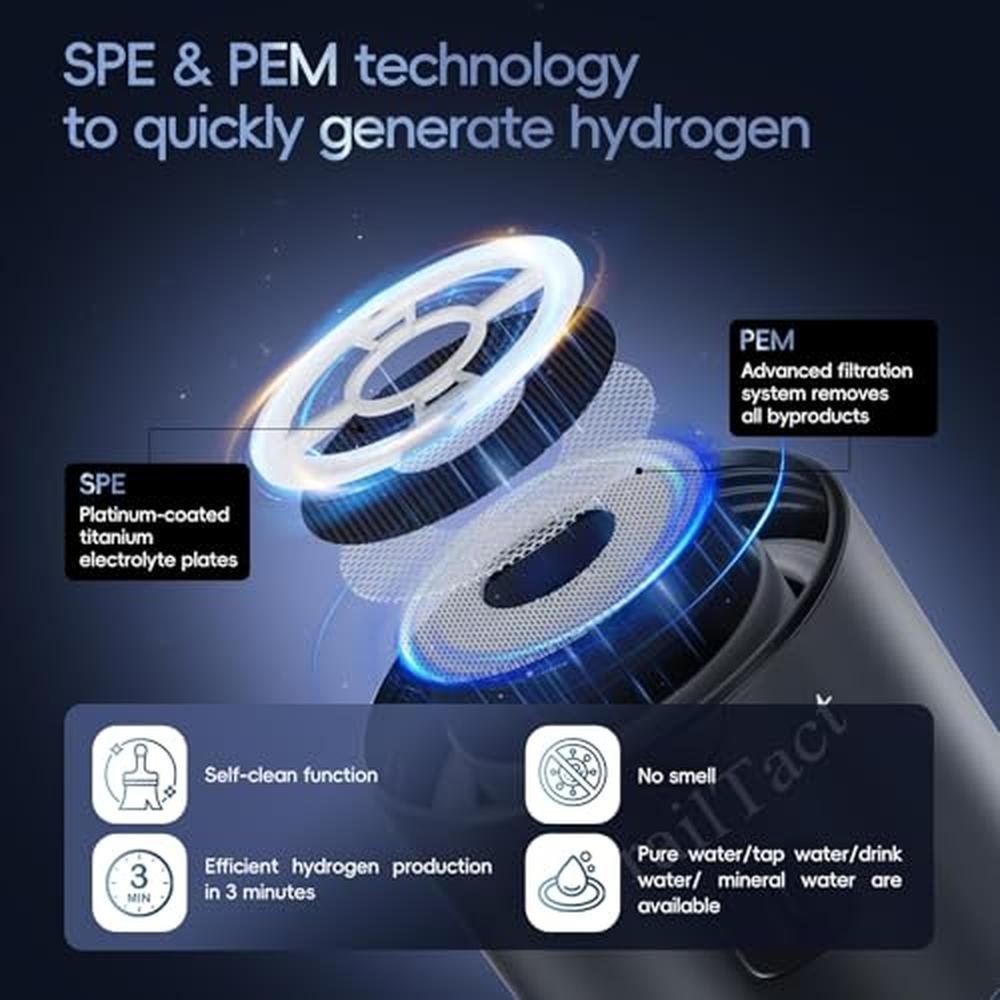 • SPE and PEM ION MENBRAE TECHONLIGY: Efficient hydrogen production in 3 minutes,adapting advanced SPE and PEM tech to extract hydrogen from water and remove all byproducts without producing chlorine.This device can work with Pure water,tap water,drink water,mineral water