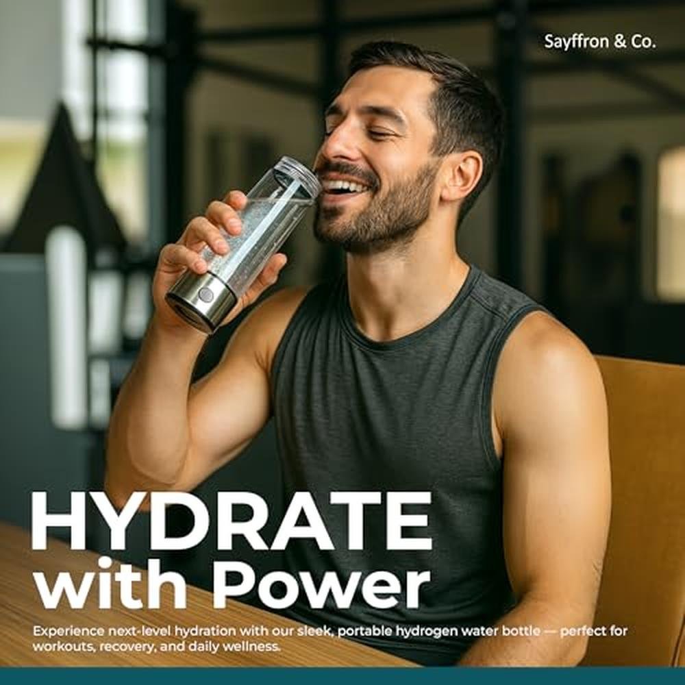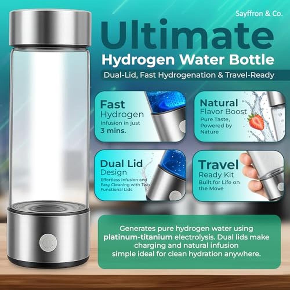 Enjoy hydrogen-rich, antioxidant water in just minutes with this portable hydrogen water bottle. Using advanced SPE/PEM technology, it works with purified, distilled, or tap water and produces up to 1600ppb of molecular hydrogenwithout chlorine or ozone. Crafted from food-grade borosilicate glass, its BPA-free, durable, and heat-resistant. The 420ml capacity makes it perfect for everyday useat home, the gym, or on the go. USB rechargeable, lightweight, and leakproof, this hydrogen water generator is a smart way to support metabolism, energy, and immunity. A great wellness gift for family, friends, and fitness lovers. For water only avoid using with juice, milk, or tea.