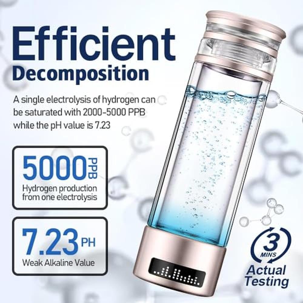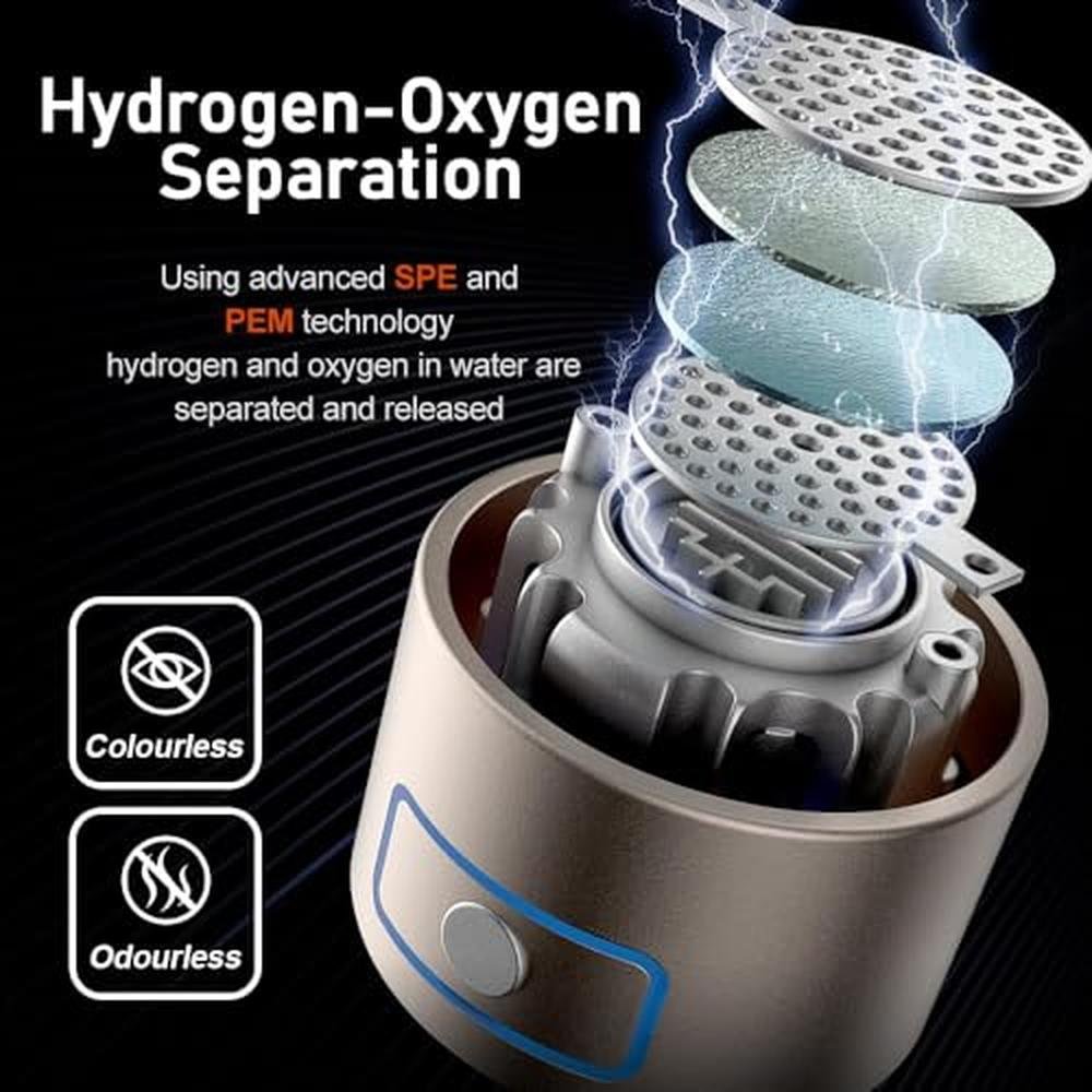 - Advanced technology: hydrogen water bottle adopts advanced SPE and PEM technology to realize the separation of hydrogen and oxygen, and quickly produce high concentration of hydrogen water. The concentration of hydrogen water can reach 2500bp, and the hydrogen water is "odorless" "no chlorine taste" "no ozone taste" "no metal taste". It can easily convert ordinary drinking water into alkaline water rich in hydrogen ions, effectively reducing oxidation.