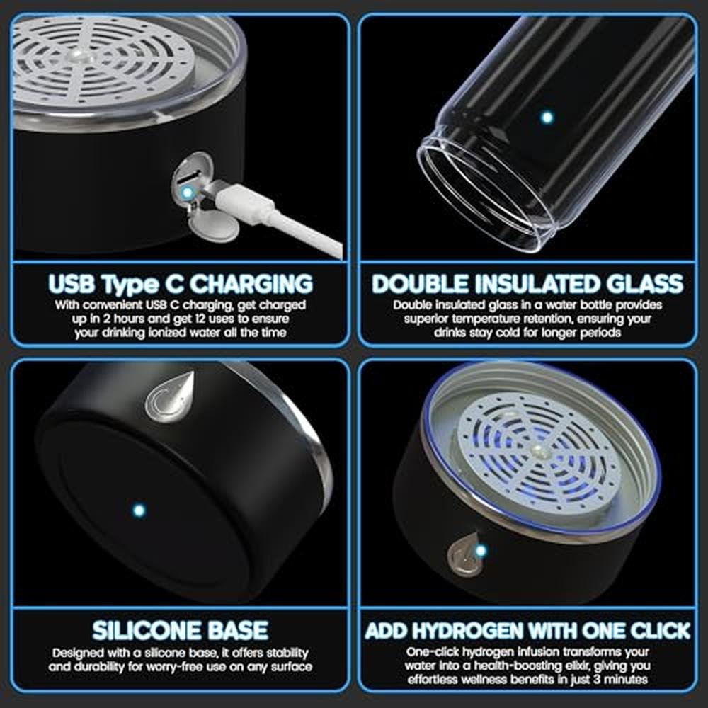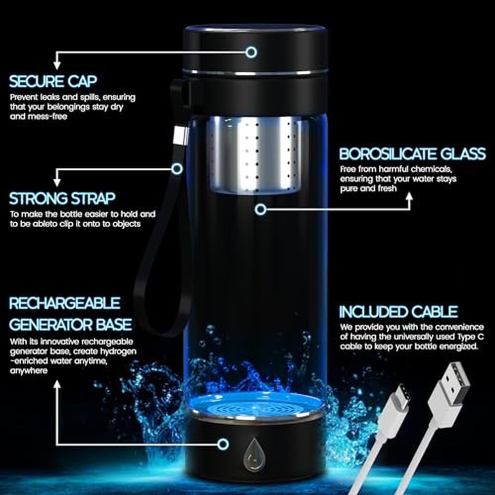 Ion Hydrogen Water Bottle - your gateway to a revitalized hydration experience! Unlock the power of molecular hydrogen with our cutting-edge Glass Hydrogen Water Bottle. Crafted with precision and innovation, this sleek and portable electric water ionizer bottle is designed to transform your hydration routine. Hydrogen water is renowned for its antioxidant properties, combating harmful free radicals and supporting cellular health. It's also known to enhance hydration, improve energy levels, and promote overall well-being. With the Hydrogen Ionized Water Bottle, you can enjoy these benefits anytime, anywhere. Harnessing the natural properties of hydrogen, our hydrogen glass water bottle transforms your water into a potent antioxidant elixir, ready to boost your well-being. Whether you're an athlete striving for peak performance, a wellness enthusiast seeking vitality, or simply someone who values staying hydrated, our Hydrogen Rich Water Bottle is your perfect companion! WHY CHOOSE OUR HYDROGEN WATER BOTTLES? - Superior quality - Features finest materials - Sleek, stylish design - Advanced electrolysis technology - Generates up to 1000 ppb of hydrogen ions - Features a built-in fruit basket - Versatile use - Easy to carry - Simple one button operation - Generous capacity - Long-lasting battery - Guaranteed Satisfaction PACKAGE INCLUDES 1 X Hydrogen Water Bottle 1 X Fruit Infuser 1 X USB C Charging Cable So why wait? ADD this hydrogenized water bottle to your basket and embark on a journey to a healthier, happier you!!