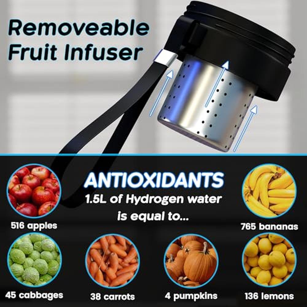 - Built-In Fruit Infuser - But that's not all - we've taken hydration to the next level by including a built-in fruit infuser in our hydrogen generator water bottle that enable you add favorite fruits or herbs to infuse your water with delicious flavors, creating a refreshing and customizable beverage tailored to your taste!