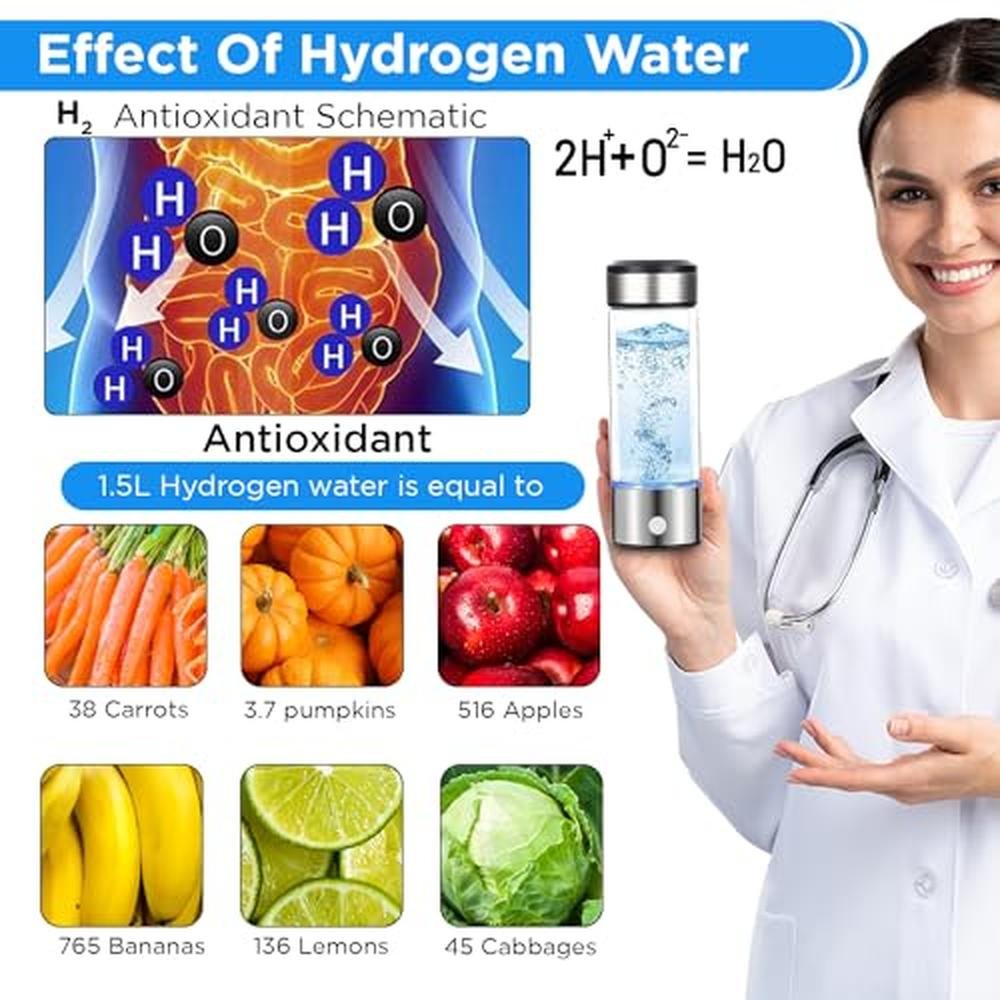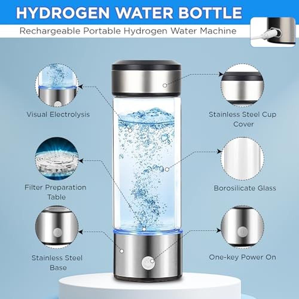 "Hydrogen water, also known as hydrogen-rich water, is recognized in Japan and Korea for its ability to remove harmful free radicals from the body. Made from high borosilicate glass for safety, it produces high-concentration hydrogen water in just 3 minutes through electrolysis. With user-friendly operation and efficient filtration, it's portable and ideal for office, travel, and various settings.