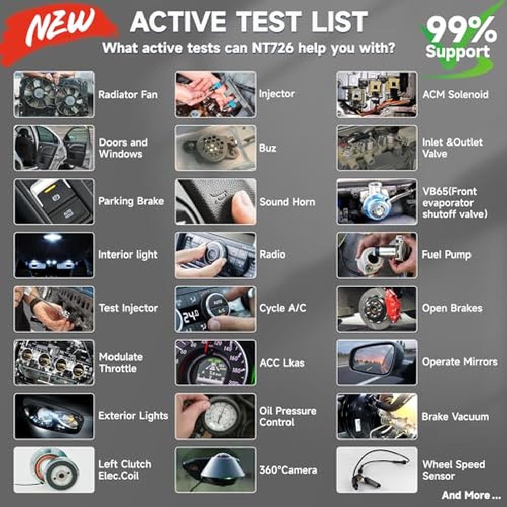 • 99% Active TestThe NT726 can perform full-module active tests, meeting all your bidirectional system needswhether you want to conduct a Fuel Injector Test or Fuel Pump Test on the Fuel System, a Spark Test or Cylinder Deactivation Test on the Ignition System, or an EGR Valve Test and Secondary Air Injection Test on the Emission Control System, and much more.