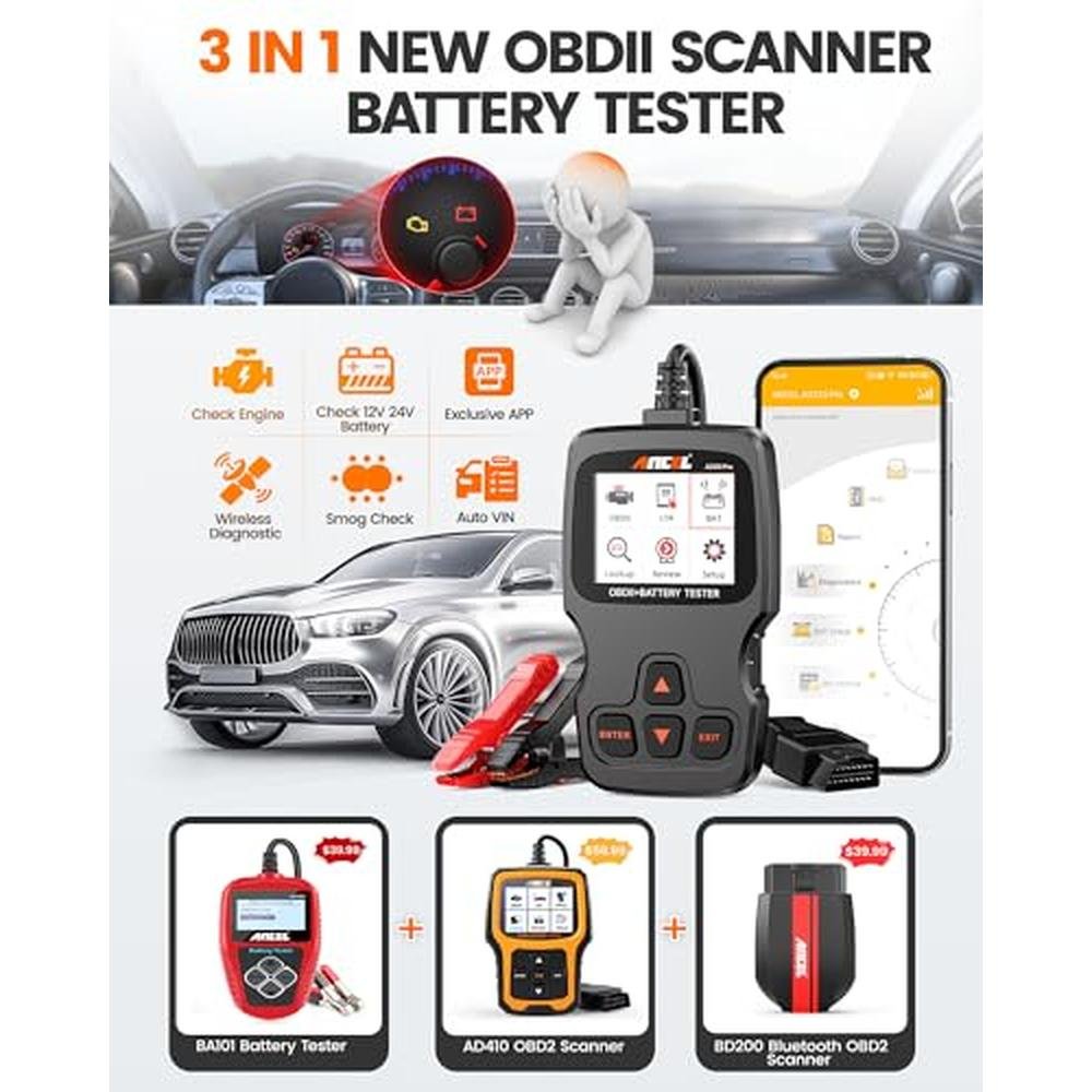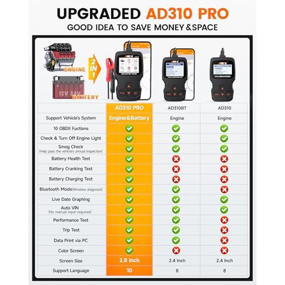 - 2025 ANCEL 3-in-1 Tech - ANCEL, the 13-year diagnostic expert, launches 2025 new product AD310 PRO. The scanner for car delivers lightning-fast solutions: 3s battery check, 0.8s Bluetooth pairing, and OBD2 deep scanning with a 10,000+ fault code library. The car code reader simplifies diagnostics for 100,000+ vehiclesauthorized DIY repairs with lab-grade accuracy.