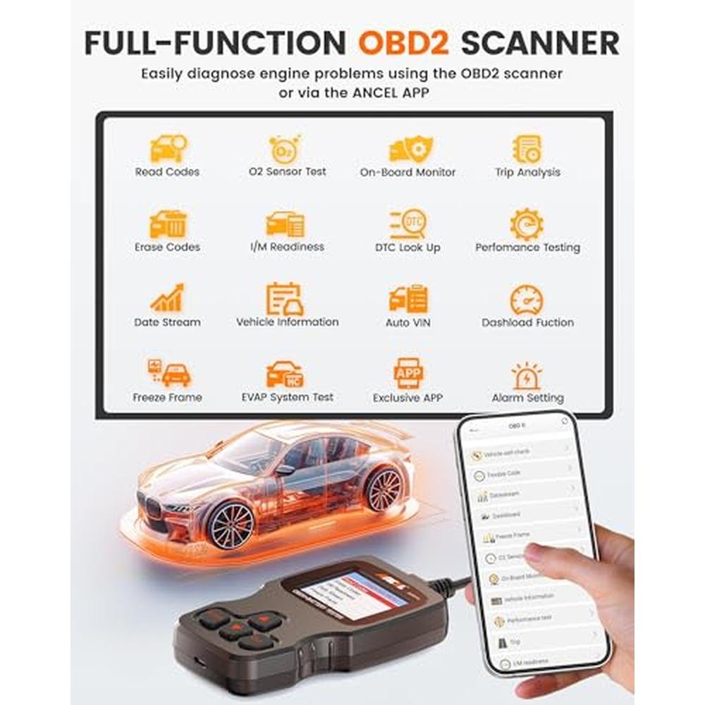 - Instant Emission Fix Test Pass - The obd2 scanner with I/M Readiness, intelligently diagnosing emission system issues. Reduces inspection time by 50%, guarantees first-pass compliance for annual checks. The obd2 scanner diagnostic tool offers full OBD2 functions: read/clear codes, live data & freeze frame, EVAP system test, O2 sensor test, etc. ANCEL obd2 scanner is compatible with all vehicles using the standard OBDII protocol.