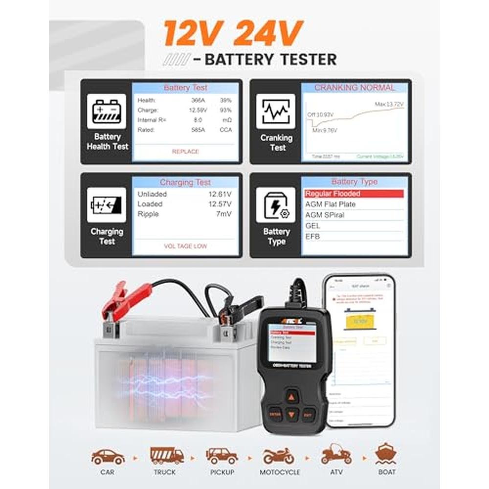 - Universal Automotive Battery Tester Expert - The battery checker tester professional analysis for 12V/24V systems. Conduct 0.01V high-precision Battery Test, Cranking Test, and Charging Test for cars, trucks, motorcycles, marine, SUVs, ATVs, and etc. Swiftly pinpoint undercharge/aging faults to gain full control over electrical systems. Real-time visualized battery health data eliminates breakdown risks!