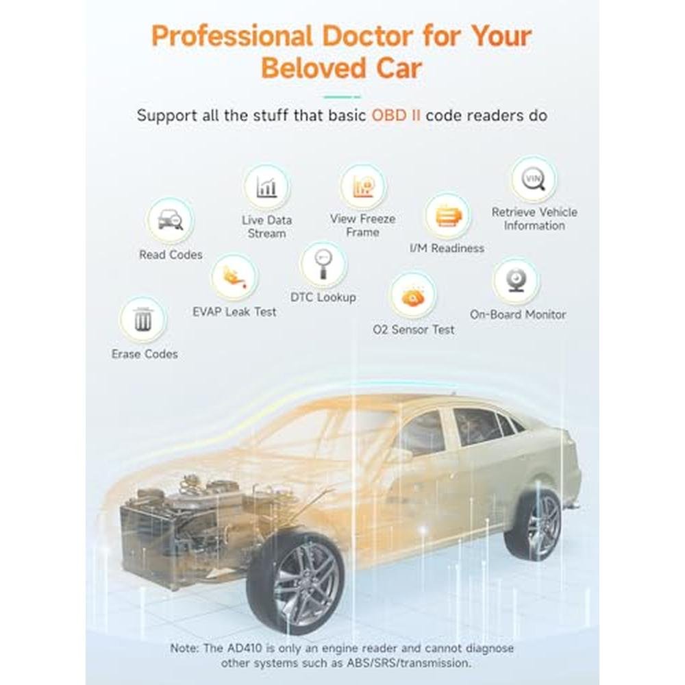 • ENHANCED OBDII DIAGNOSTICS Comprehensive System Testing. This engine obd2 scanner diagnostic tool offers advanced diagnostics, including testing of O2 sensors and EVAP systems. Perform a leak test on your vehicle's EVAP system and monitor the fuel tank's integrity. The O2 sensor test helps fine-tune the air/fuel mixture, improving fuel efficiency and reducing emissionssaving you money at the pump and reducing your car's environmental impact. !!! Note: The AD410 is only an engine code reader, it DOESN'T support other systems such as ABS, SRS, Transmission and others.