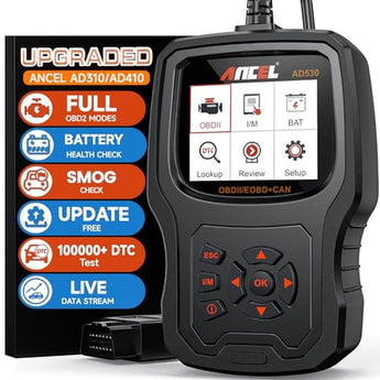 - 2025 Upgrade 2-in-1 OBD2 Scanner: ANCEL AD530 OBD2 scanner diagnostic tool is upgraded from AD310 in the actual fault detection of 300,000 cars. It can not only check the engine failure, provide maintenance suggestions, but also act as a professional battery tester, which can check the health of the car battery. It is a real two-in-one code reader that has been tested by the market. Owning AD530 is equivalent to owning AD310 and a professional car battery tester at the same time