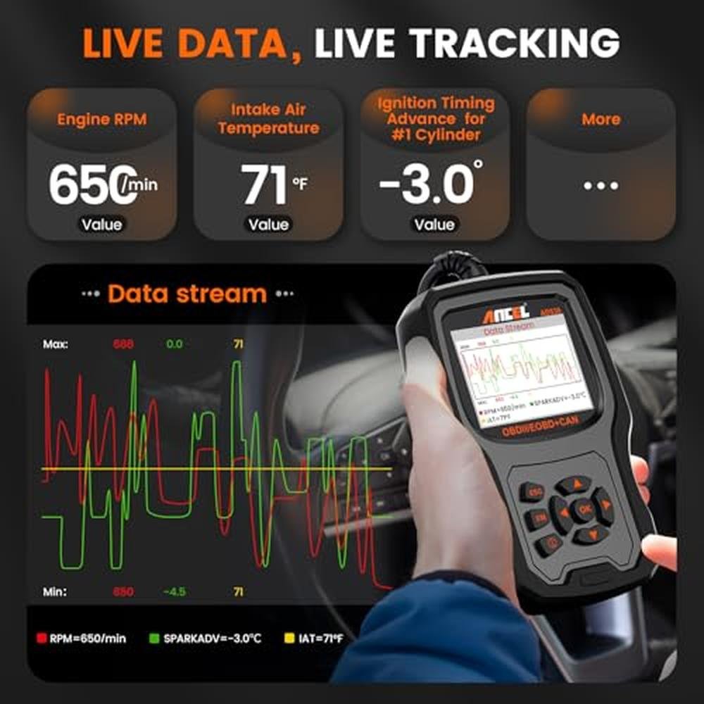 - 10 Full OBD2 Functions: Car diagnostic scanner supports turning off engine light (CEL), reads/clears fault codes, graphs live data streams, displays freeze frame data, tests O2 sensors, performs EVAP system test, checks I/M readiness status (emissions), tests advanced on-board monitoring, and retrieves vehicle information (VIN). In addition, this OBD scanner is equipped with the latest industrial chip, which makes the scanning speed 2X faster than other vehicle code readers