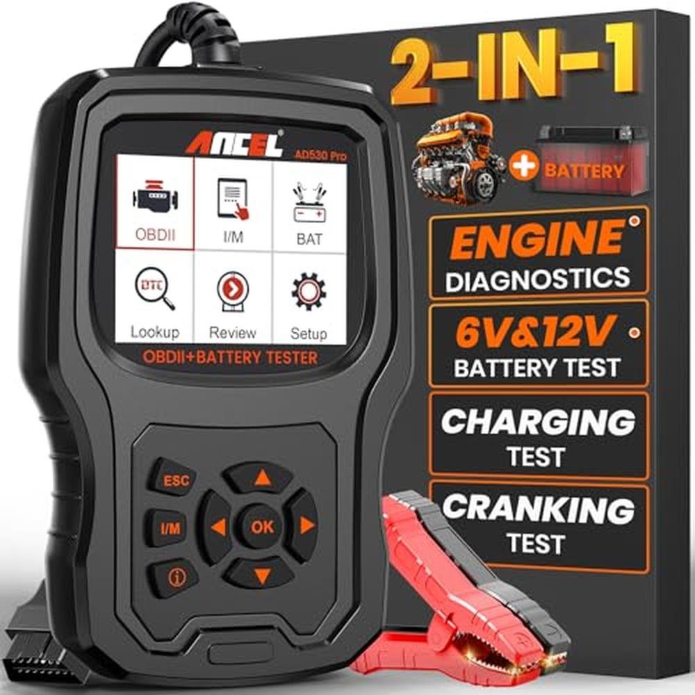 • Upgraded 2 in 1 Check Engine & Battery: ANCEL AD530 PRO combines full-function OBD2 scanner with advanced battery tester (100-2000 CCA) in one compact tooldiagnosing engine lights and starting issues in seconds! Upgraded from the AD530, it adds cranking/charging tests for complete battery analysis. Featuring a 36% larger 2.8" screen compared to standard 2.4" screen, upgraded insulated clamps, and silicone protective case, it delivers pro-grade performance at half the cost of separate tools