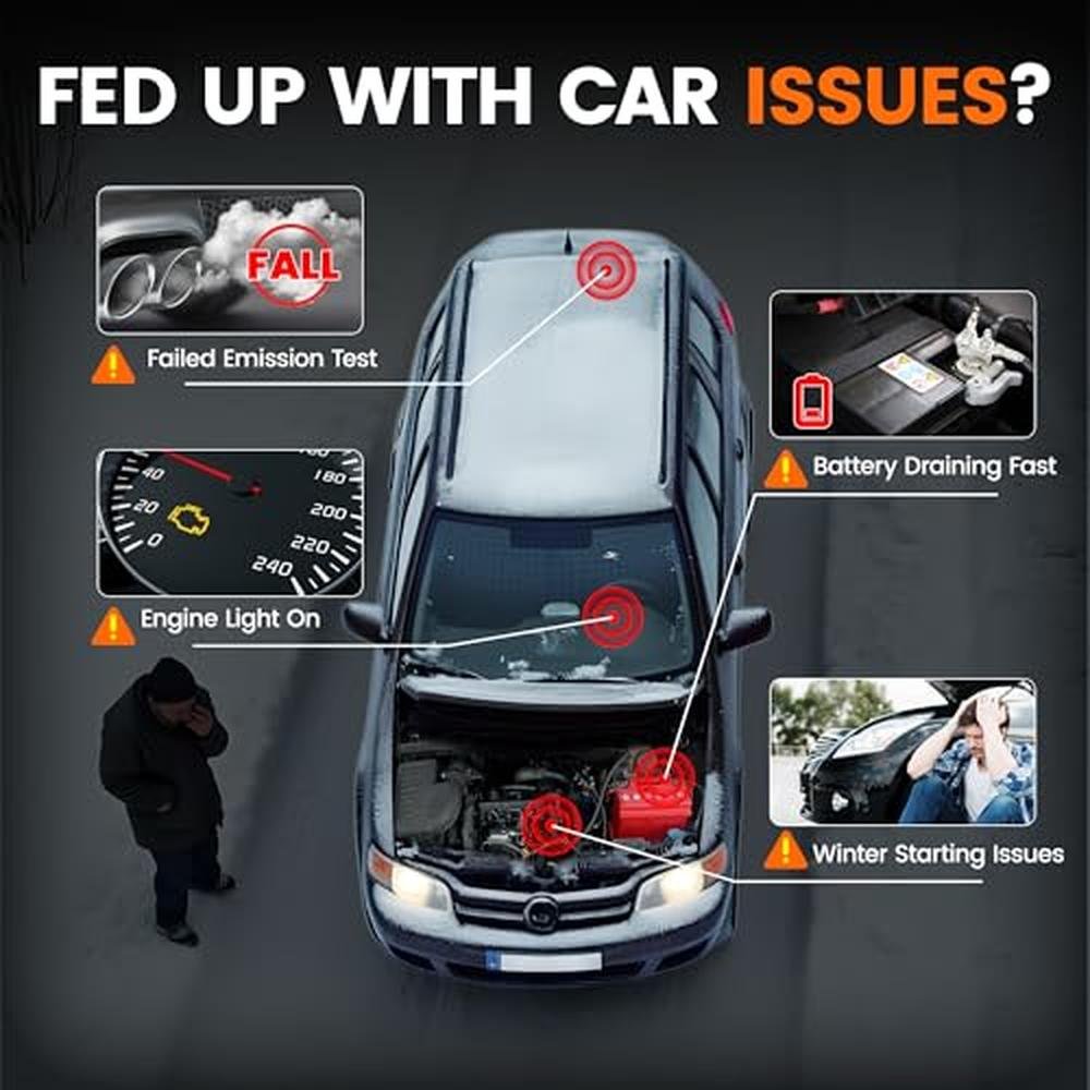 • Comprehensive Battery Test: Car battery tester performs comprehensive testing on all common battery types (Flooded, AGM Flat Plate/Spiral, GEL, EFB), delivering 20% more accurate measurements than other testers. It evaluates critical parameters like voltage stability, internal resistance, SOH, SOC and CCA in milliseconds. Cranking test detects starter motor issues while charging analysis verifies alternator performancecrucial to prevent unexpected car battery failures and ensuring safe driving
