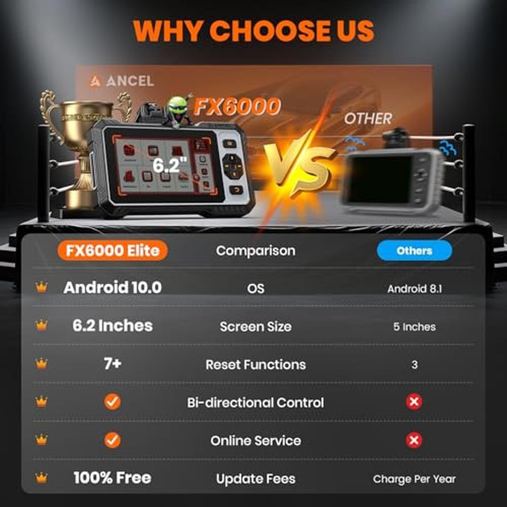 - Enhanced Android Performance2025 New ANCEL FX6000 Elite OBD2 Scanner offers more than basic scanners, it adopted on Android 10.0 OS powered by quad-core processing, letting you install apps, switch tasks seamlessly, and dominate diagnostics. Its intuitive interface beats generic scanners. Equiped with 6.2" HD touchscreen, touch and button dual operation mode, and massive 32GB ROM + 2GB RAM configuration stores 50,000+ diagnostic reports. Rugged enough for garages.