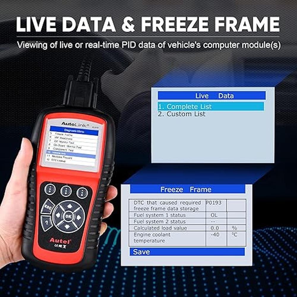 - Live Data and Freeze Frame DataWith Live Data functions, Autel AL619 OBD2 diagnostic code reader allows you to view the live PID (Parameter Identification Data) of the vehicles computer module(s) in text, graph to check the status of various sensors. And Freeze Frame Data enables you to view the vehicles operating parameters at the moment a DTC is detected. These information will aid the technician by allowing the parameters to be duplicated for diagnostic and repair purposes.