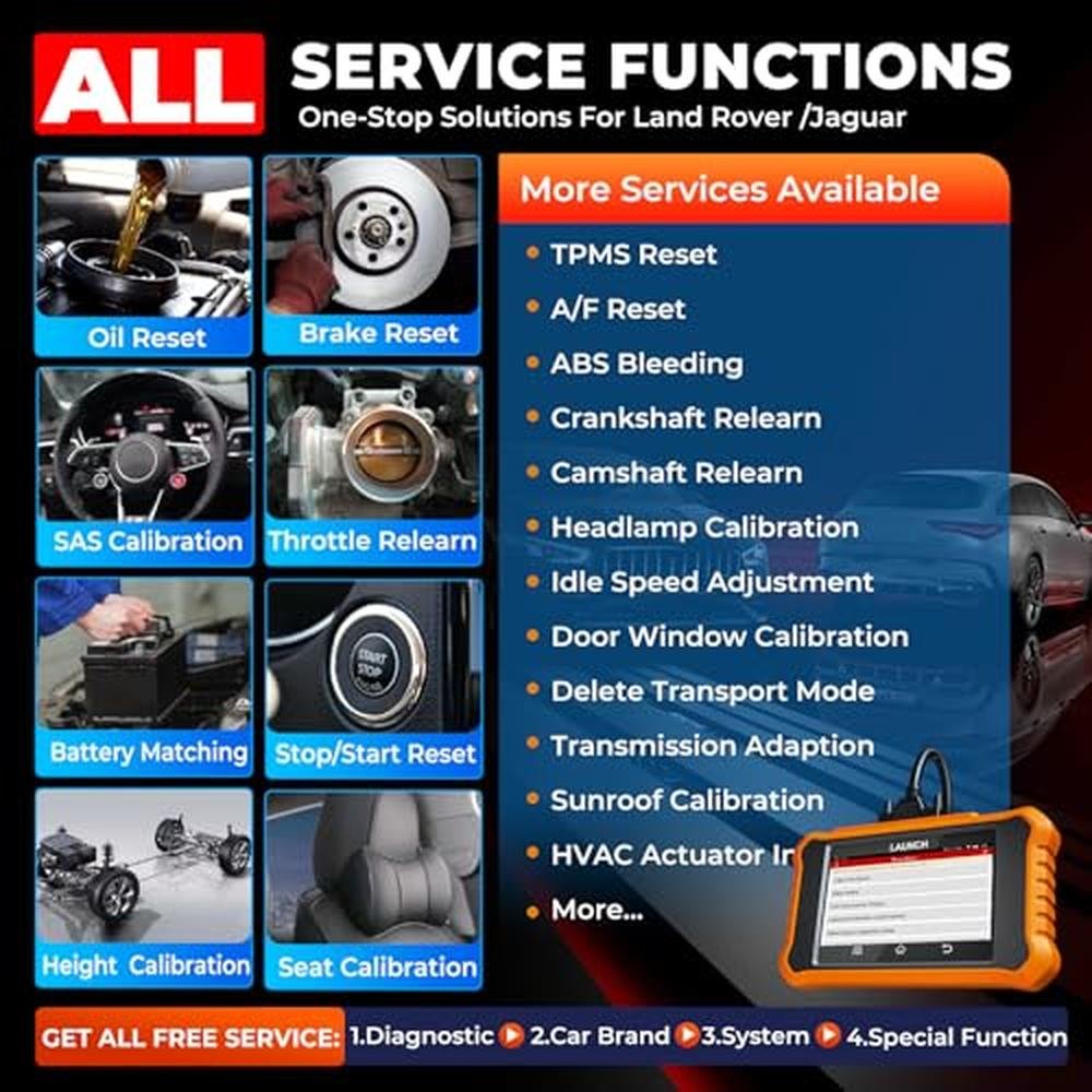 • ALL FREE MAINTENANCE SERVICE LAUNCH Creader Elite V2.0 diagnostic scan tool offers ALL FREE Services for Land Rover Jaguar, make daily repair a breeze, such as Oil, EPB, Battery, SAS, Injector Coding, Throttle Relearn, Height Calibration, Transmission Adaption, Crankshaft/Camshaft Relearn, Sunroof Calibration, etc. Save your ton of repairing buck from dealership. Get All services from "Diagnose>Brand>System Selection>Special Function". Check compatibility via obdbox21 @ 163 . com firstly.