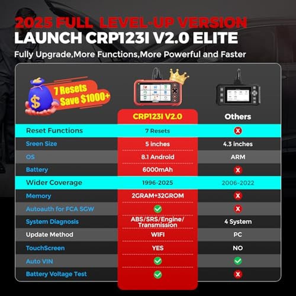 LAUNCH OBD2 Scanner CRP123I V2.0 Elite,2025 Lifetime Free Update Engine ABS SRS at Diagnostics Tool with 7 Resets,Oil/Throttle/SAS/BMS/EPB/DPF Reset/ABS Bleeding Car Scanner,Battery Test,FCA SGW