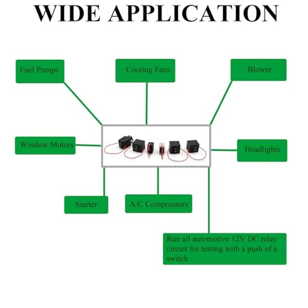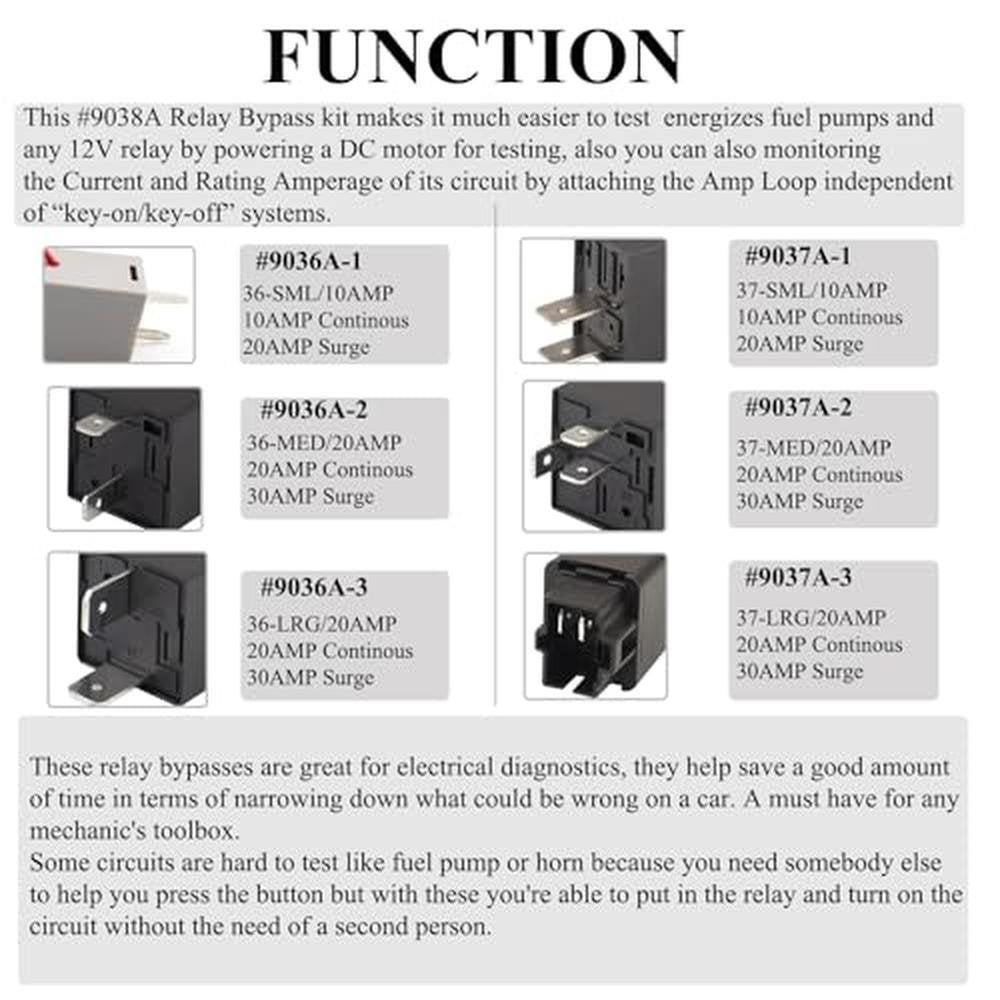 - FUNCTION: This Relay Bypass kit makes it much easier to test the FUEL PUMPs, COOLING FANS, BLOWER and WINDOW MOTORS, also you can also monitoring the Current and Rating Amperage of its circuit by attaching the amp Loop