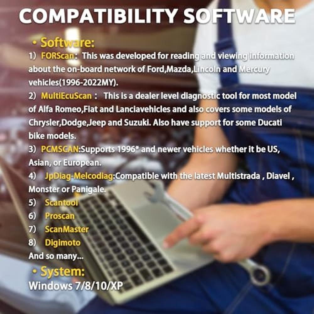 • Extensive Software SupportThis elm327 obd2 scanner is compatible with a wide range of third-party diagnostic software applications. Such as,Scan-Master,Scan-tool,Proscan,PcmSCAN,Digimoto,FOR-Scan,MelcoDiag,JpDiag and so many.You can choose the software that suits your preferences and needs.