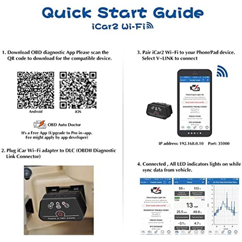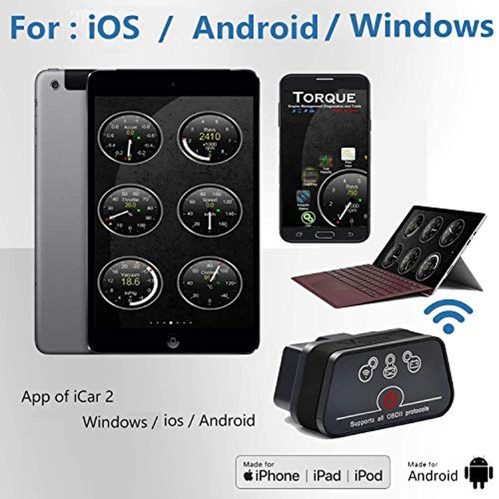 • - Stable WiFi - Vgate iCar2 WiFi OBD2 code reader can connect to your car wirelessly in a small and compact size; Plug and play, easy to install in your car OBD2 port and display real-time sensor data on your phone and tablet devices