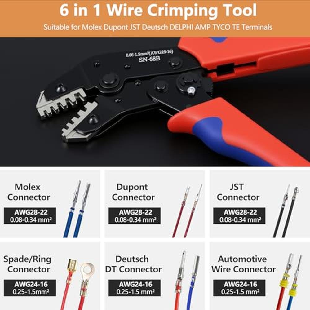 6 in 1 Wire Crimping Tool, Amliber AWG 28-16 Wire Crimper for Non-Insulated Open Barrel Terminal Connectors, Electrical Crimping Pliers for Molex Dupont JST Deutsch DELPHI AMP TYCO TE Terminals
