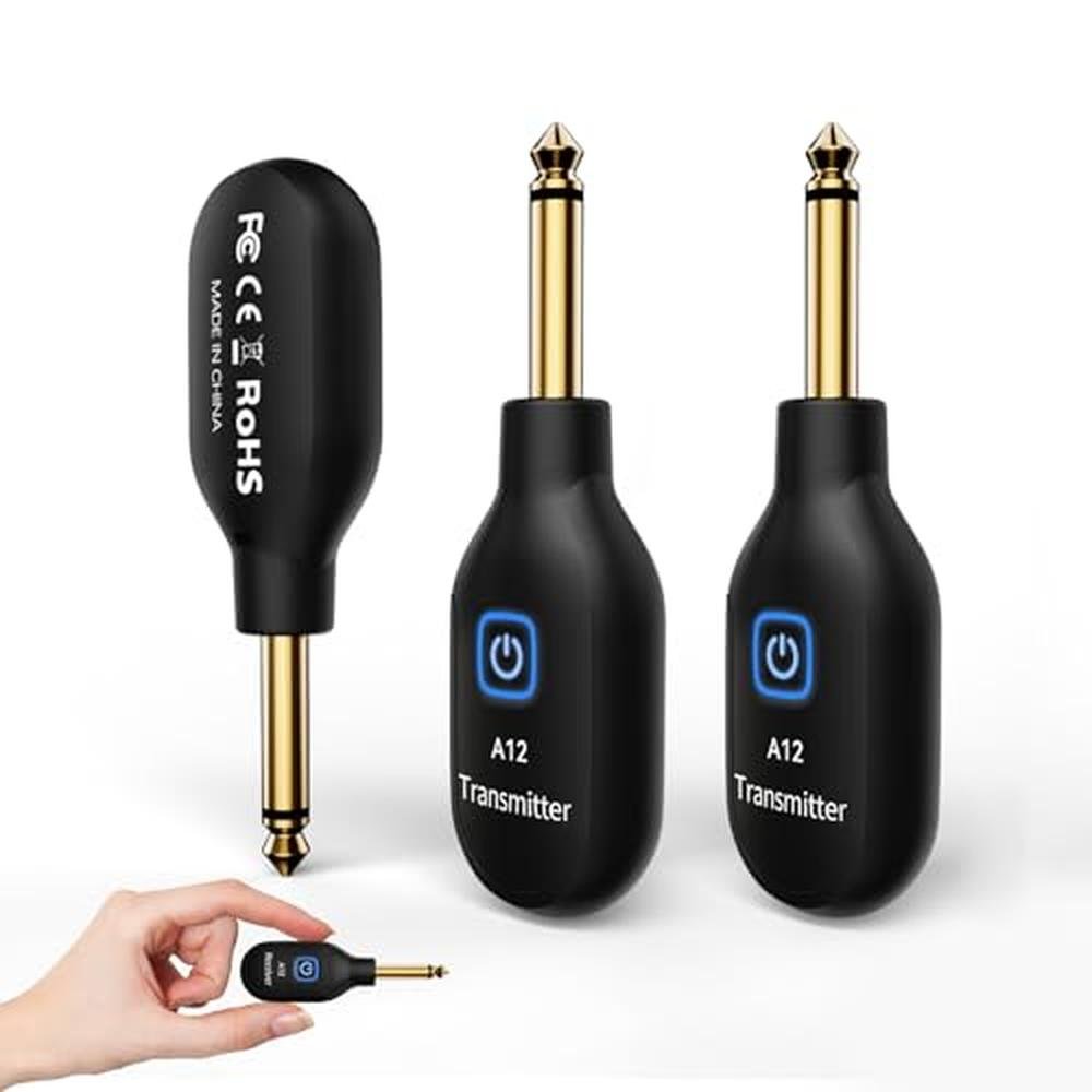 A12 Wireless Guitar Transmitter Receiver - 2.4GHz System, 24-bit 48KHz Audio, 100ft Range, No Latency, Rechargeable, Easy Pairing for Electric Guitar & Bass - Accessories (2TX+1RX)