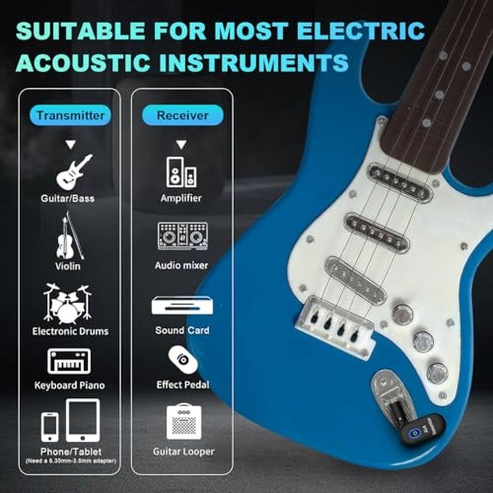 Product Parameters Brand: WENTELMUSIC Model: A14-2 Frequency: 2.4GHz Audio Quality: 24-bit/48KHz Effective Range: 100 feet Battery Life: Up to 5 hours Charging: Dual USB cable includedProduct Highlights The WENTELMUSIC A14 Wireless Guitar System is engineered for guitarists seeking a high-performance, hassle-free audio experience. Operating on a 2.4GHz frequency, it boasts superior anti-interference capabilities, ensuring reliable connections even in crowded environments. With 24-bit/48KHz audio quality, musicians can enjoy crystal-clear sound and less than 4ms latency, making it perfect for live performances. The 100-foot range allows freedom of movement on stage, enhancing performance dynamics. The system features a built-in rechargeable lithium battery, providing up to 5 hours of continuous playtime. A dual USB charging cable is included for convenient recharging, ensuring that you're always prepared for your next gig. Setup is effortless with the plug and play design; simply press a button to pair the transmitter and receiver, eliminating tangled wires and streamlining your setup. Its 90 rotating plug design guarantees compatibility with a variety of instruments, including electric guitars and basses, making it an essential accessory for any musician. Usage Scenarios The WENTELMUSIC A14 Wireless Guitar System is ideal for: Stage Performances: Enjoy the freedom to move while playing, without being tethered to your amplifier. Rehearsals: Perfect for practicing without the hassle of cables, allowing for a more dynamic playing experience. Recording Sessions: Capture high-quality audio without interruptions or signal loss. Mobile Gigs: Lightweight and portable, this system is a must-have for musicians on the go, whether for weddings, parties, or any event requiring reliable sound. Multi-Instrument Setup: Ideal for musicians who use both electric guitars and basses, allowing seamless transitions between instruments.Elevate your musical performance with the WENTELMUSIC A14 Wireless Guitar System, the ultimate solution for modern guitarists!