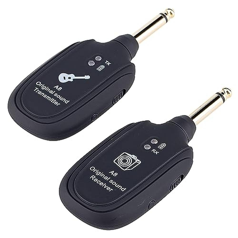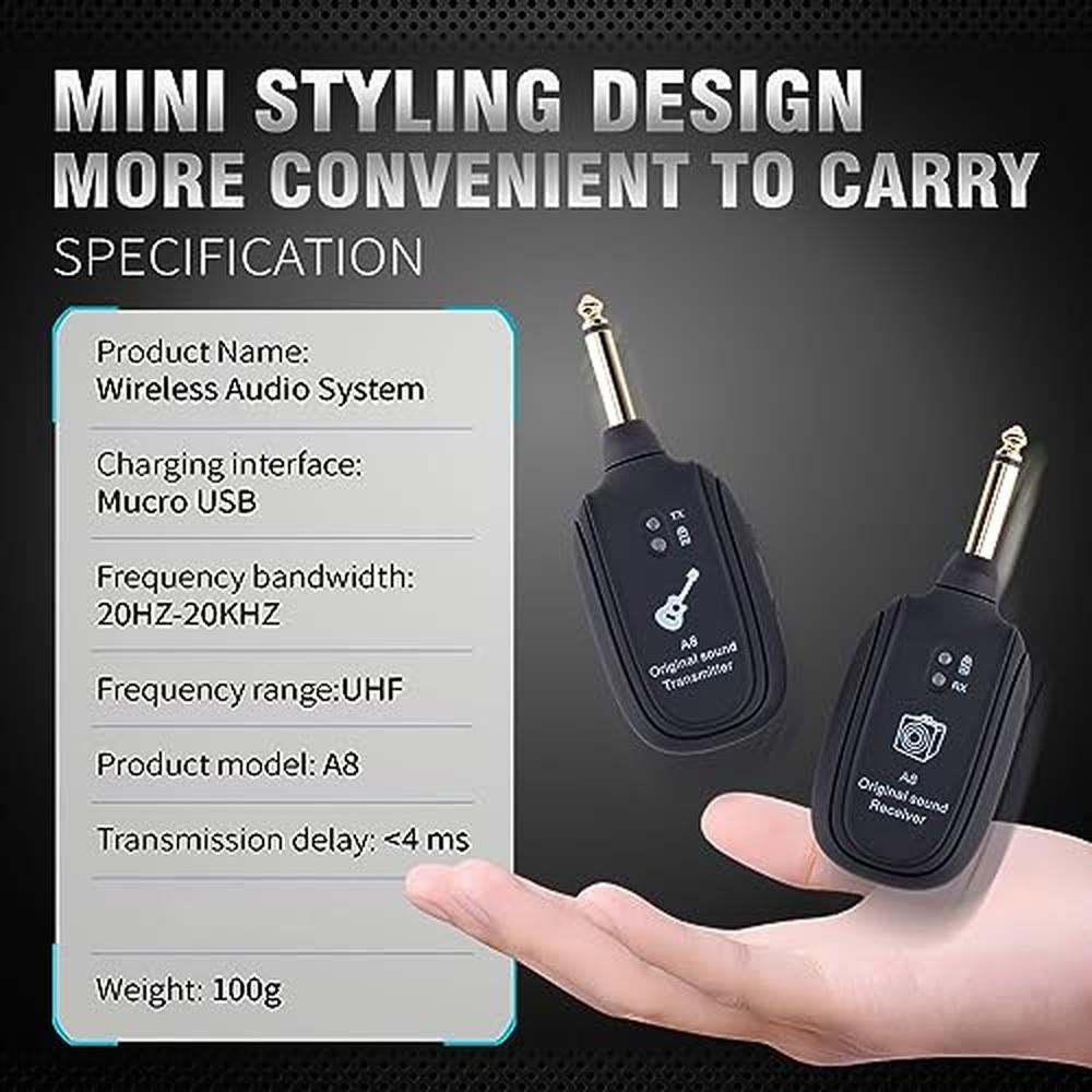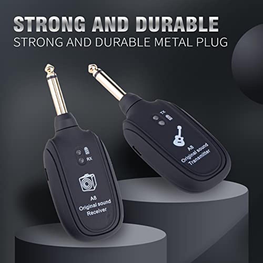 Advanced Technology : The guitar transmitter receiver adopts wireless transmission technology, with a wide frequency range and supports uncompressed signal transmission. The outdoor transmission range exceeds 30m/100ft and is not subject to wire entanglement. Easy to Use : Take out the wireless guitar transmitter without installation. After turning on the power, press the signal button to match the transmitter and receiver at the same time, plug in the stereo instrument, and freely play the electric bass guitar. Multi device interference free : The wireless transmitter supports 4 sets of equipment working at the same time, one transmitter to one receiver, ultra-high frequency sound transmission, anti-interference, low noise, 4ms" latency, allowing you to freely roam on stage and truly perform dynamically Long Working Time : The wireless transceiver has a built-in rechargeable lithium battery and is equipped with a double-ended USB charging cord, which can be charged simultaneously. When fully charged, the guitar transceiver can work for up to 4 hours, ensuring that you can fully play every performance. Widely Used : The wireless microphone system has clear signal transmission and is suitable for most electric guitars, basses, violins, keyboards, electric guitars, and even the most popular electronic instruments with a 6.35mm jack. 100% Customer Satisfaction : Our guitar wireless systems have undergone rigorous testing and quality audits. We can quickly solve problems and provide a 2-year warranty to ensure a 100% customer satisfaction experience.