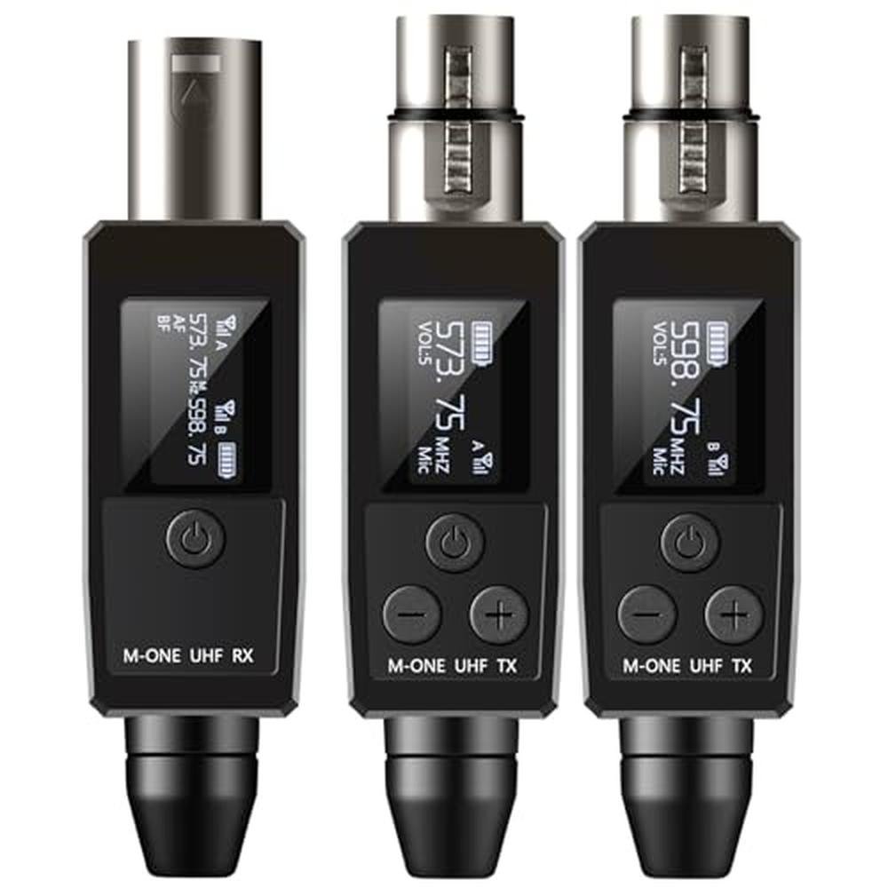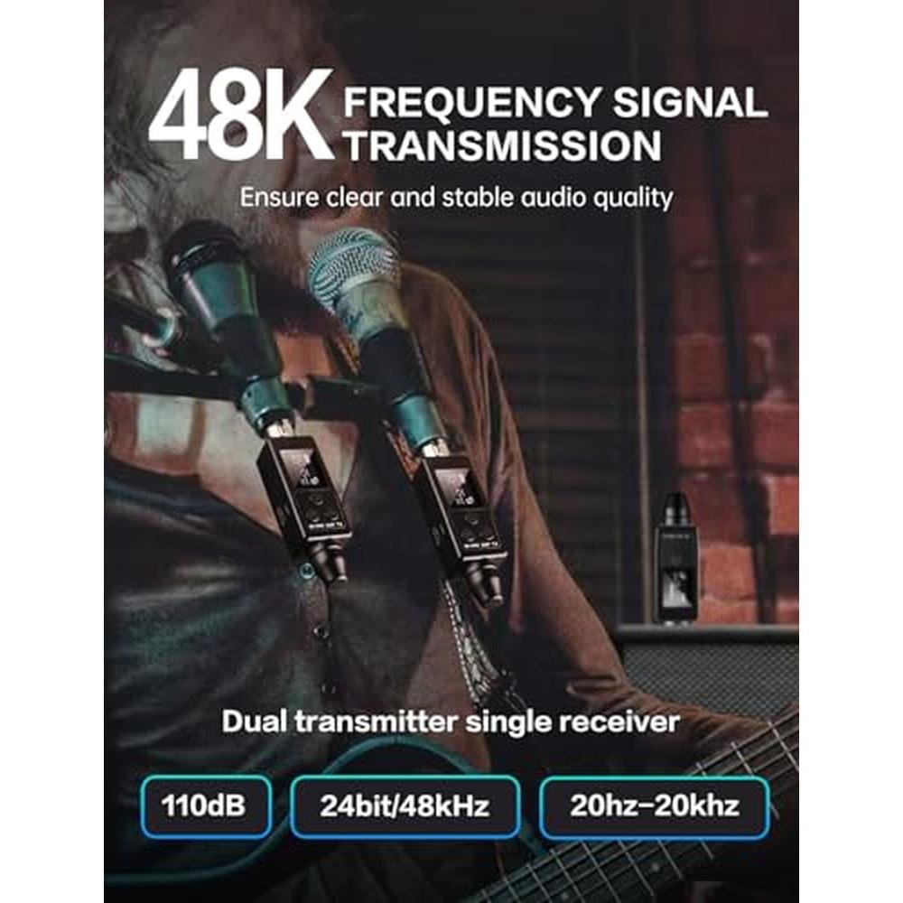 - XLR transmitter and XLR receiver, Supports 15 sets simultaneously in the same location. Suitable for anydynamic/harmonic microphone, mixer, PA system, providing stable and reliable wireless transmission. Suitable forany active speaker, perfect for venues, weddings, and mobile DJs. Delay less than 0.25 miliseconds, can broadcastsimultaneously on 20 channels.