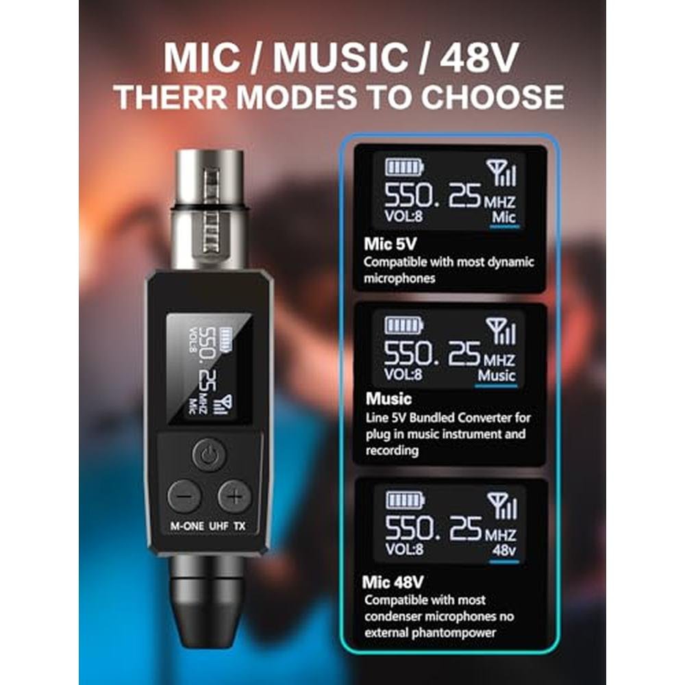 Elevate your audio experience with this versatile UHF Wireless XLR Transmitter and Receiver Plug-on WirelessMicrophone System. Designed for dynamic and condenser microphones, electric guitars, basses, and more, thissystem offers exceptional sound quality and reliable performance. With 48V phantom power, it ensures optimaoperation with condenser microphones. Seamlessly integrate it into your audio mixer, PA system, or any othercompatible setup for hassle-free wireless audio transmission. Enjoy the freedom of movement and enhanced audioclarity, making it an ideal choice for live performances, presentations, or any audio-related application.