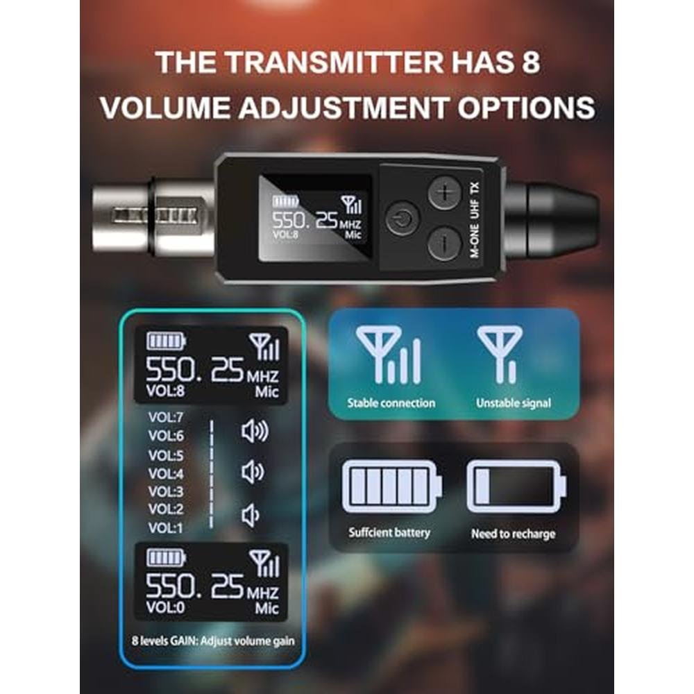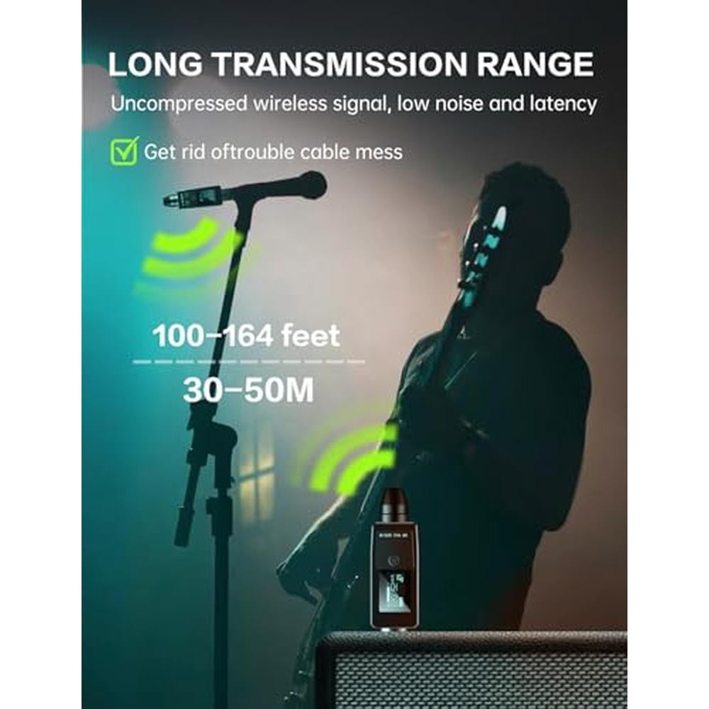 - wireless microphone system frees wired microphones from traditional cables, enabling wireless transmission up to50 meters / 164 feet (30 meters / 100 feet for obstacles). lt also supports remote volume signal adjustment, allowingyou to control the volume remotely.