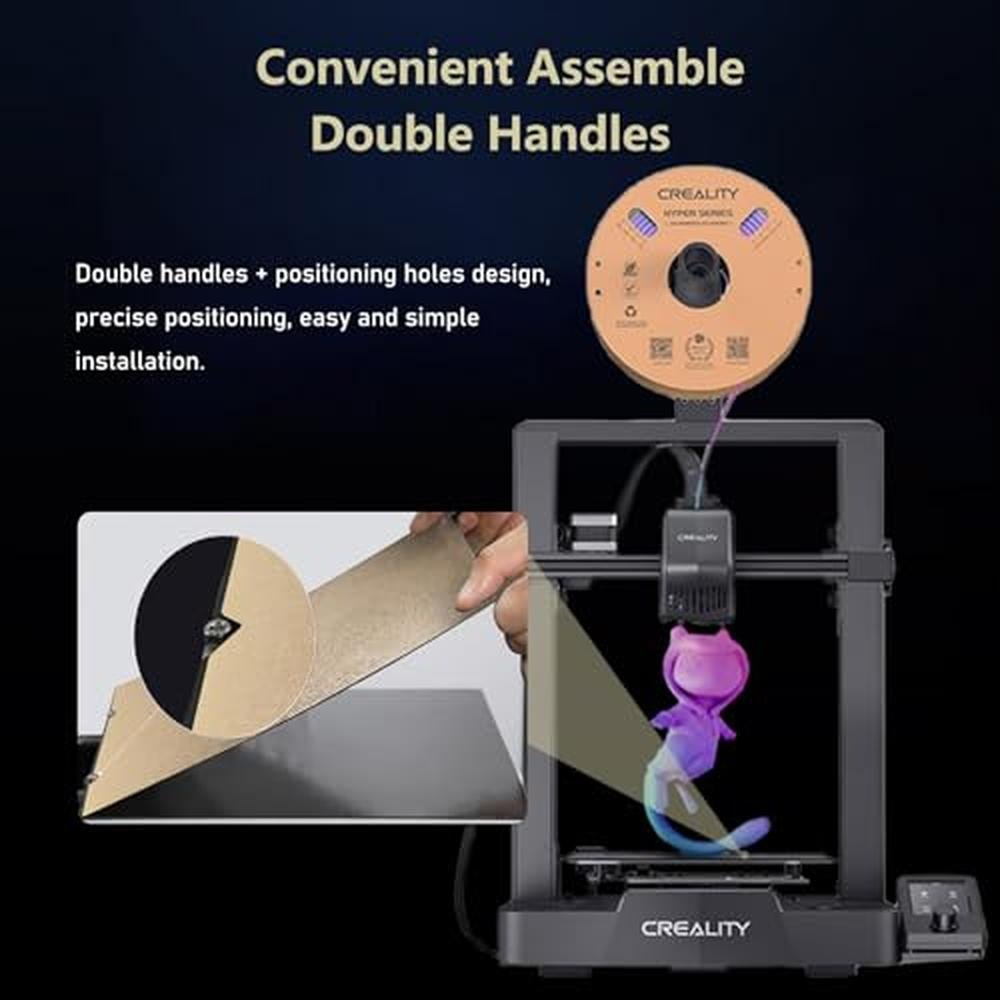 - Positioning Holes Design - Double handles + positioning holes design, precise positioning, easy and simple installation. The PEI spring steel 235x235mm makes the prints easy to adhere to the printing surface, and it is easy to remove the prints and flex slightly to pop your print right off.