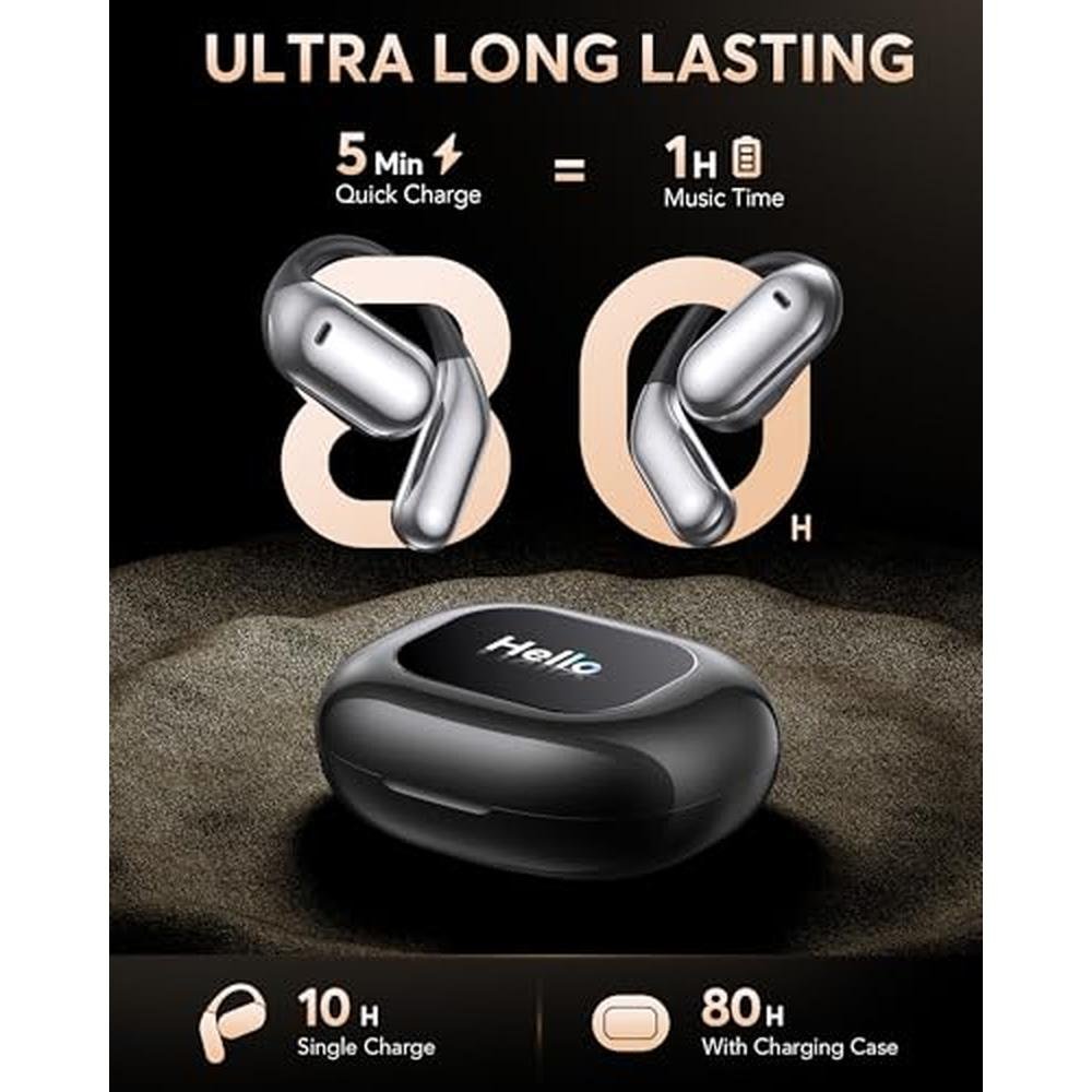 - 80-HOUR TOTAL PLAYTIME & FAST CHARGING Enjoy up to 8 hours of playtime on a single charge, with the compact charging case offering an additional 72 hours for a total of 80 hours of use. A 5-minute quick charge provides 1 hour of playback, so your ultra open ear headphones wireless Bluetooth are always ready to go. Perfect for powering through busy days or extended listening sessions.
