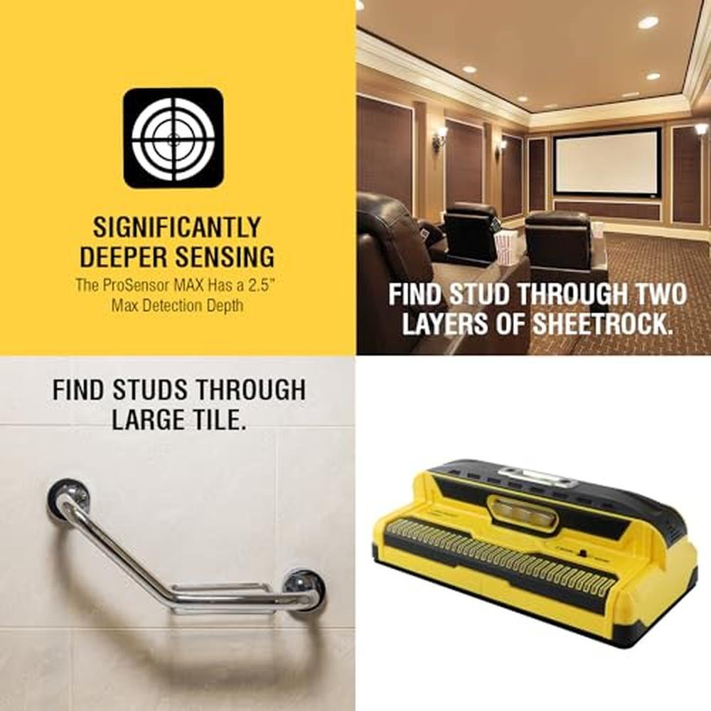 • ACCURATE: More sensors = More accuracy. Conventional stud finders have 1 or 2 sensors. The ProSensor MAX had 13, making it the most accurate stud sensing tool on the market. The ProSensor MAX has a max detection depth of 2 1/2" for thick walls. The precision LEDs track the location of studs while displaying the center and edges simultaneously.