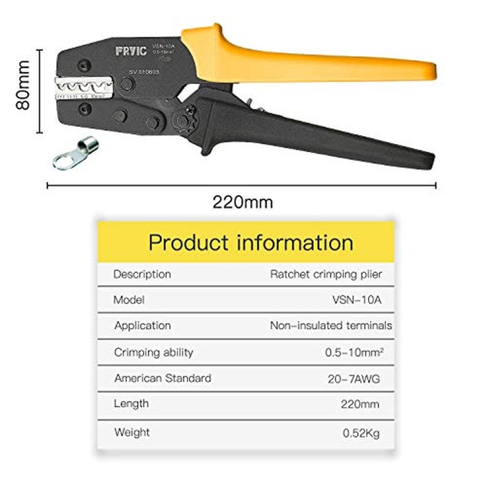 Product DescriptionFEATURES: Ergonomic Handle Design provides improved gripping power. Adjustable Ratchet and Lever Action Construction reduces fatigue degree. Special Four-Mandrel Crimping Style for Square Crimp. High quality crimping standard ensures repeatable crimping action. Ideal for crimping insulated and non-insulated wire ferrules. Quick release safety lock.Crimping Plier: SPECIFICATIONS: Color: Yellow Item Name: Mini-type Self-adjustable Crimping Plier Material: TPR Elastic plastic and carbon steel Product Type: Square VSC8 6-4C Crimping Range: 0.08~10 mm2 ( A.W.G.: 28~8) Total Length: 175mm Range of Application: Cable cord End terminals