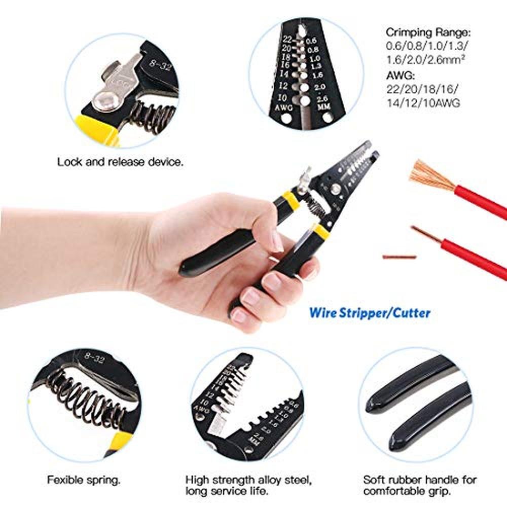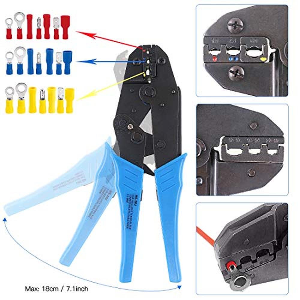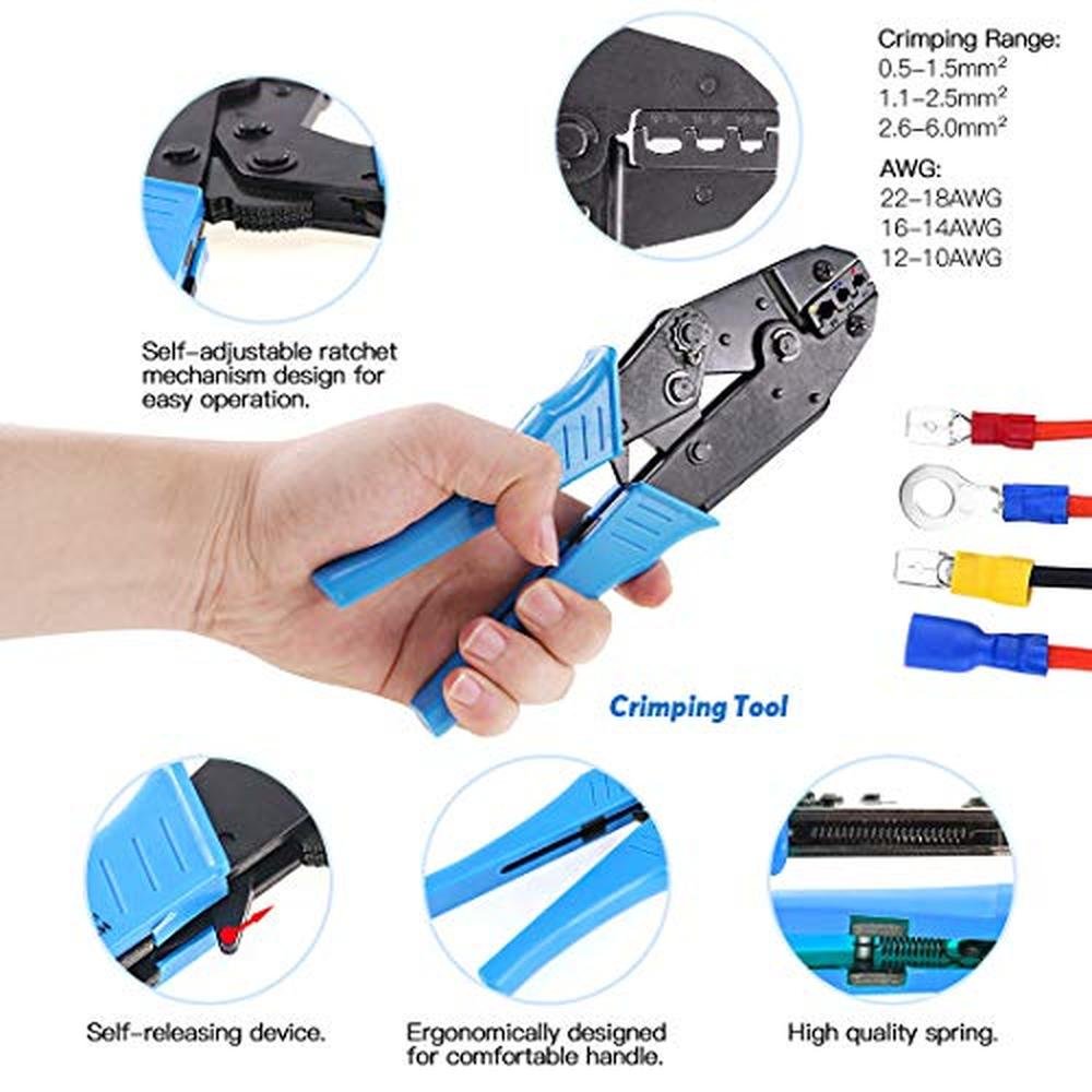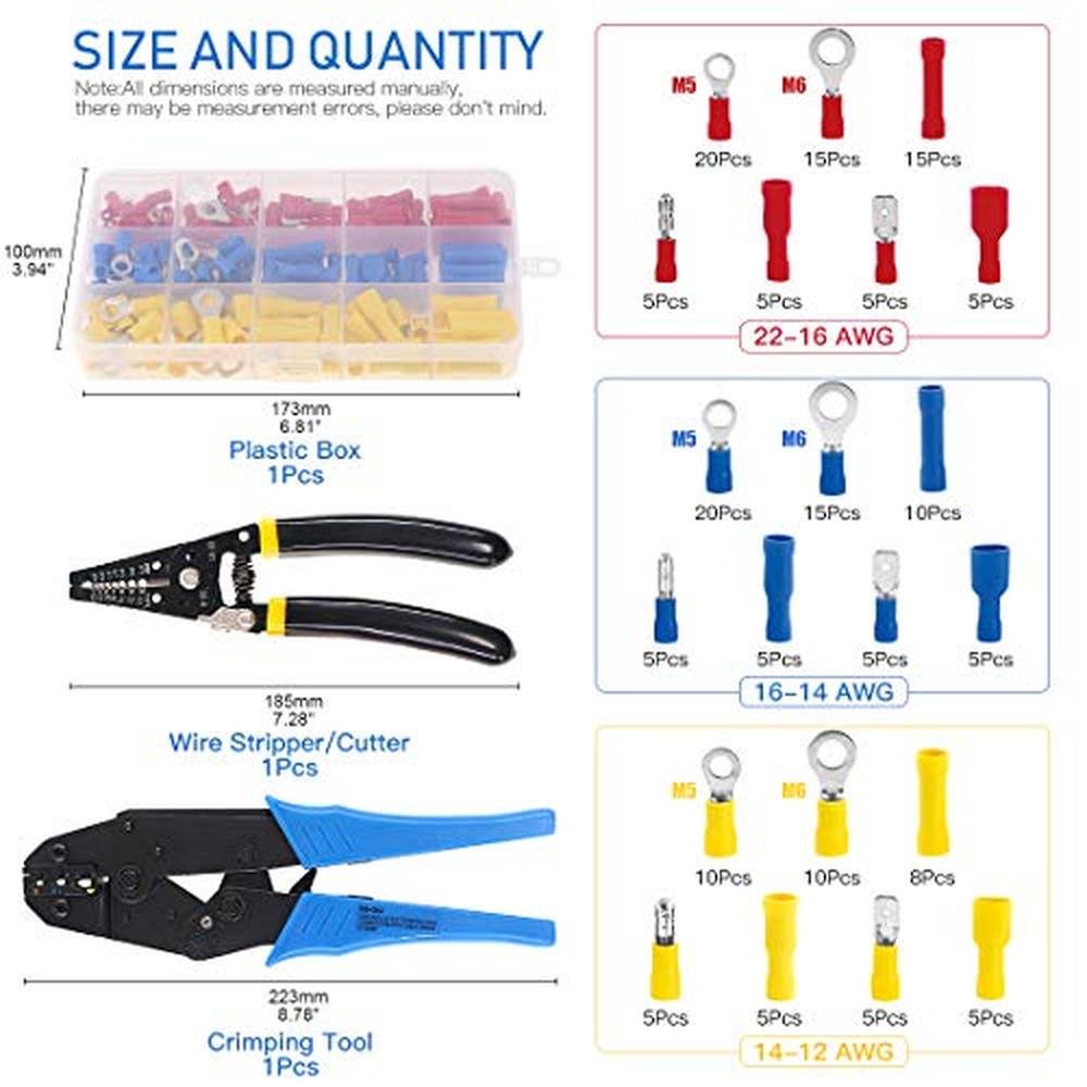 Glarks Professional Self-Adjustable Ratchet Wire Crimping Pliers AWG 22-10 and a Wire Stripper Too Set with 183Pcs Insulated Butt Bullet Spade Ring Crimp Terminals Connectors Assortment Kit Specification: Crimping Range: 22-16/16-14/12-10A.W.G (0.5-1.5mm2, 1.1-2.5mm2, 2.6-6.0mm2) Crimper Material: Chrome vanadium steel Handle: High Quality Rubber Connector Material: Tinned Copper and PVC insulation Connector Wire Range: 22-16 ( red ) / 16-14 ( blue ) / 12-10 ( yellow ) A.W.G 183Pcs Terminal Connector Detail: Red: 22-16 AWG M5 ring ----------------- 20Pcs M6 ring ----------------- 15Pcs Male Bullet ------------- 5Pcs Female Bullet ---------- 5Pcs Male Spade ------------- 5Pcs Female Spade ---------- 5Pcs Butt Splice -------------- 15Pcs Blue: 16-14 AWG M5 ring ----------------- 20Pcs M6 ring ----------------- 15Pcs Male Bullet ------------- 5Pcs Female Bullet ---------- 5Pcs Male Spade ------------ 5Pcs Female Spade --------- 5Pcs Butt Splice ------------- 10Pcs Yellow: 12-10 AWG M5 ring ------------------ 10Pcs M6 ring ------------------ 10Pcs Male Bullet -------------- 5Pcs Female Bullet ----------- 5Pcs Male Spade -------------- 5Pcs Female Spade ----------- 5Pcs Butt Splice ---------------- 8Pcs Total Quantity: 183Pcs Package included: Wire Crimping Plier Tool x 1 Wire Terminals Connector x 183 Wire Stripper x 1