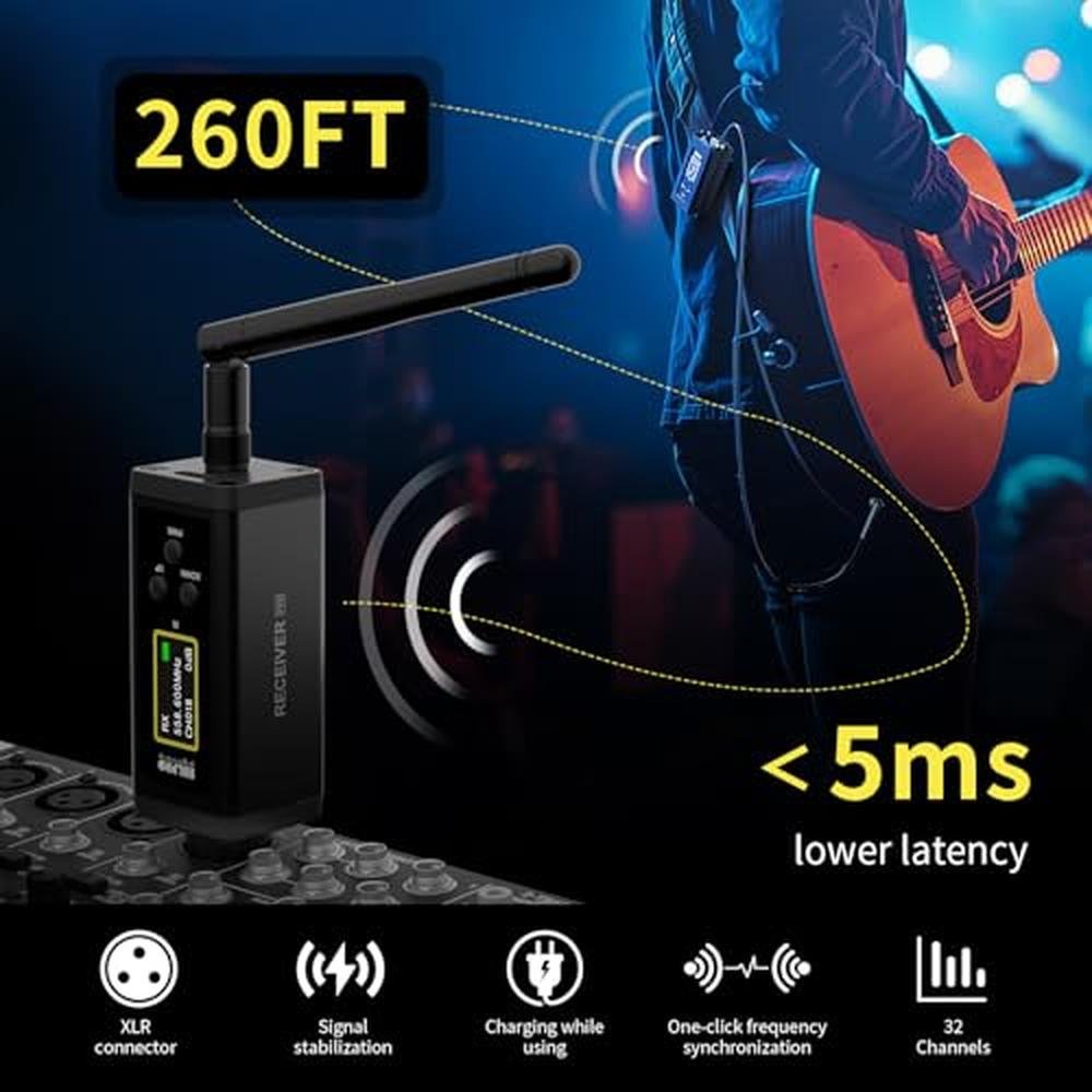 - UHF & 260FT Transmission Distance: Employing advanced UHF wireless transmission technology, the wireless guitar system offers an effective transmission range of up to 260 feet. Ensure a high-quality wireless transmission experience with low latency,low noise,and lossless audio quality
