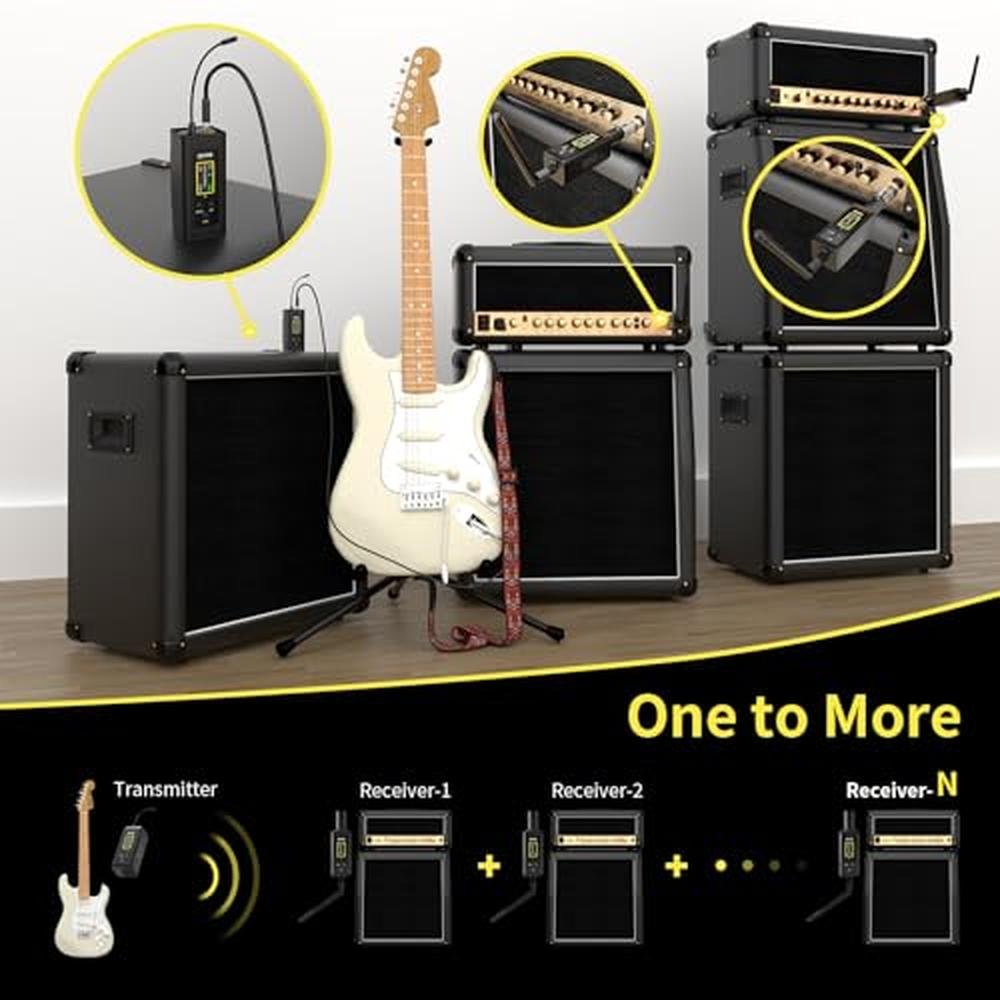 - Built-in 32 Channels & One-to-More:The wireless guitar system supports 32 sets of transmitters and receivers working simultaneously.Also allows one transmitter to match multiple receivers,making it suitable for gig, rehearsal or live performances involving multiple performers