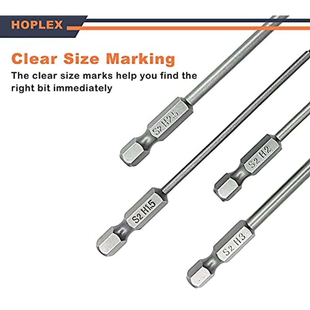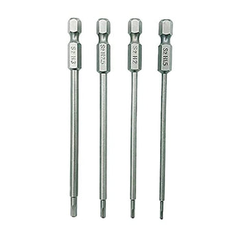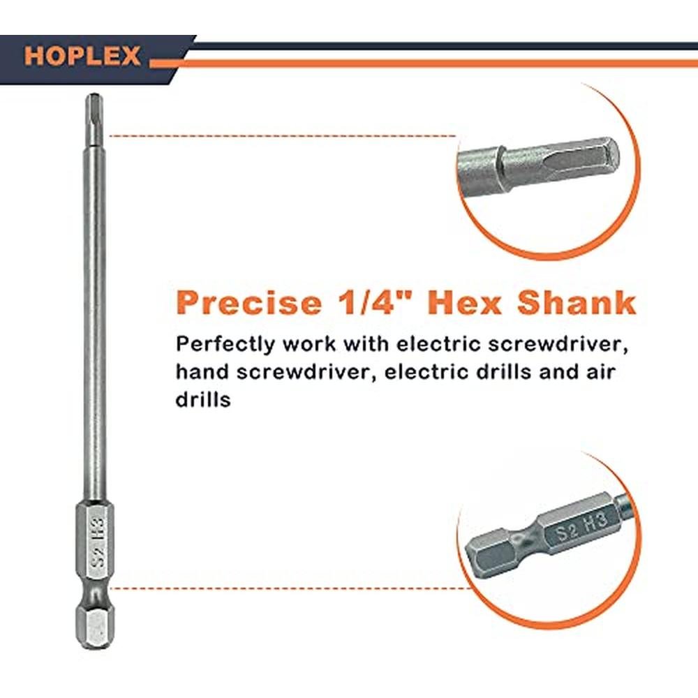 HOPLEX 1.5 2.0 2.5 3.0mm Hex Bit Set 1/4" Hex Shank for Screwdrivers Bit Electric Screwgun/Power Drill Key Features: 1.5mm 2.0mm 2.5mm 3.0mm, satisfy your different needs Made of heat treated steel material, with high hardness and high torque Strong magnetic bits, minimize the wear of screws, increase working efficiency Clear size marks on bits for easy identification and use Specification: Materail: steel material Length: 100mm/3.93inch Type of Shank: 6.35mm / 1/4 inch hex Type of Driver Head: 1.5mm/2.0mm/2.5mm Total Weight: 51gNoteThe oil on the surface of the bits prevents the bits from rusting and ensures long-term use. Package List: 1 * 1.5mm hex bit 1 * 2.0mm hex bit 1 * 2.5mm hex bit 1 * 3.0mm hex bit