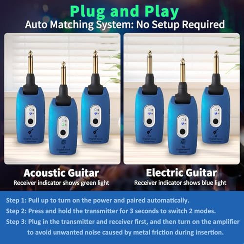- Clear Wireless Audio Transmission: 2.4GHz wireless guitar tsystem uncompressed wireless signal transmission, no interference, about 100 feet transmission distance, low noise, low latency (less than 12ms" ), no wires,more freedom